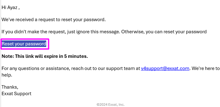 4. An email will be sent to you from <notification@exxat.com> with instructions on how to create a new password. Click on "Reset your password" and follow steps to create a new password.