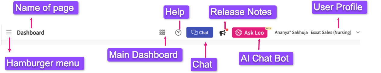- Hamburger Menu: Click on the hamburger menu to access all the different pages and sections to manage your day-to-day work