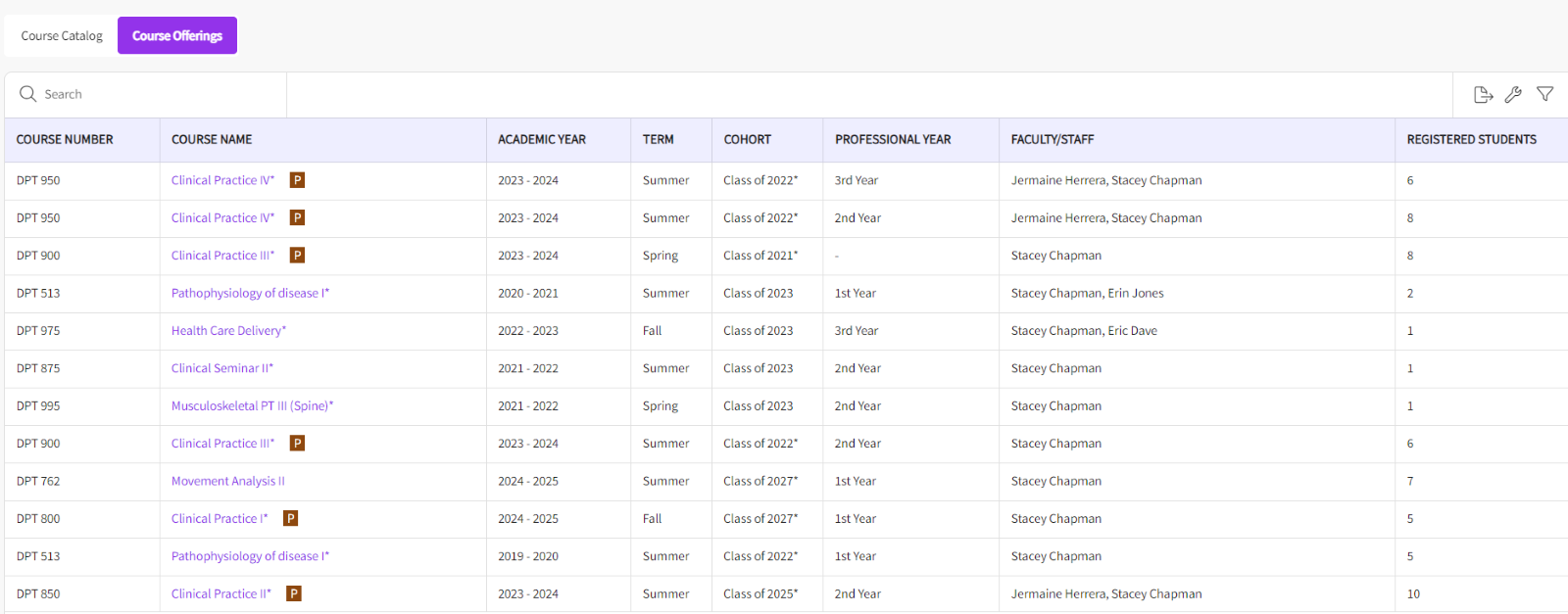 The Curriculum Grid will show you grids which provide an overview of the academic trajectory or progression for a group of students enrolled in your program. You will see all courses, and if you are not assigned to them, they will be in view-mode only and will not allow any edits.
