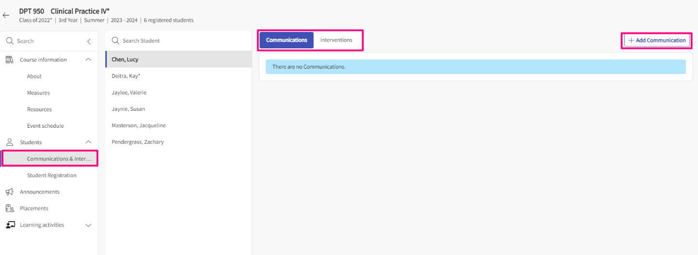 You also have the option to add communications and interventions for the students enrolled in the course you are associated with.