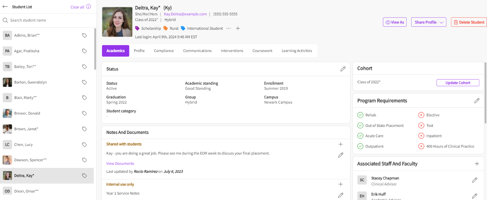 Within the system, you can view and manage the students that you work with. Whether it’s viewing or sharing their profile, viewing the overall status of their compliance items, adding communications, and interventions, or reviewing their placement and learning activities, this section can do it all!