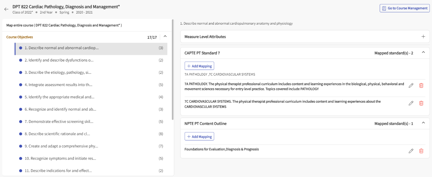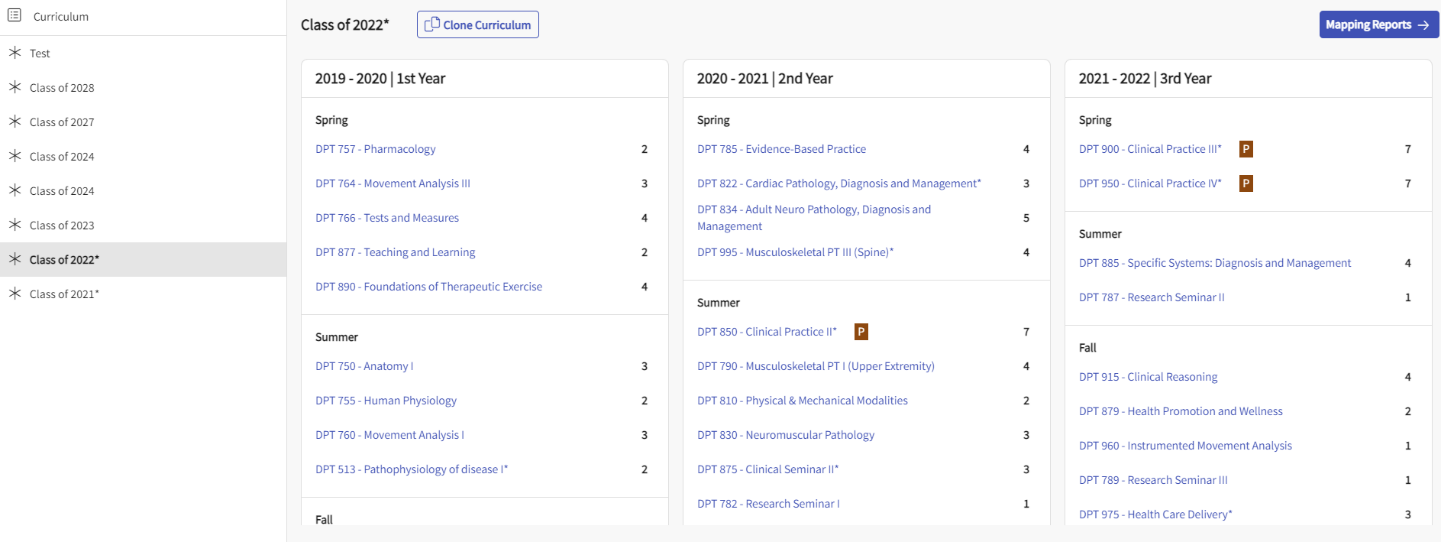 Your program may create curriculum grids to easily track the academic trajectory or progression for a group of students enrolled in your program. If so, you will connect objectives and measures to accreditation standards, program goals, and more. With the assistance of reports, you can also find gaps and ensure even coverage of content.