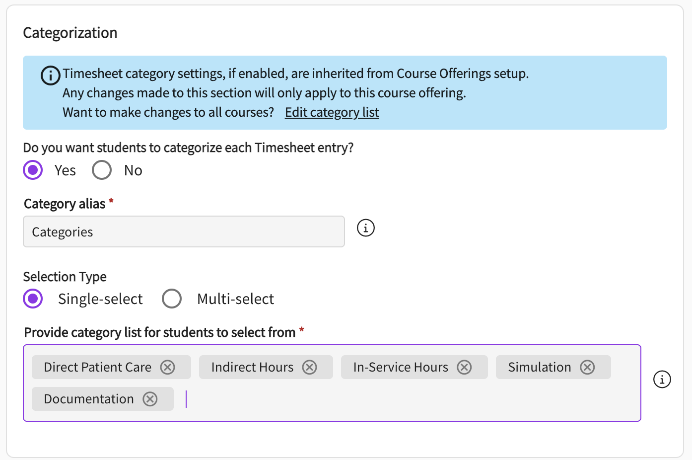 Note: Timesheet category settings are inherited from the Course Offerings setup. Any changes made here apply only to this course offering.