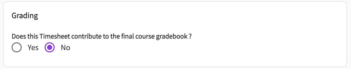 In the Grading section, specify whether timesheets affect the course grade.Select Yes if timesheet data should contribute to the final course gradebook.