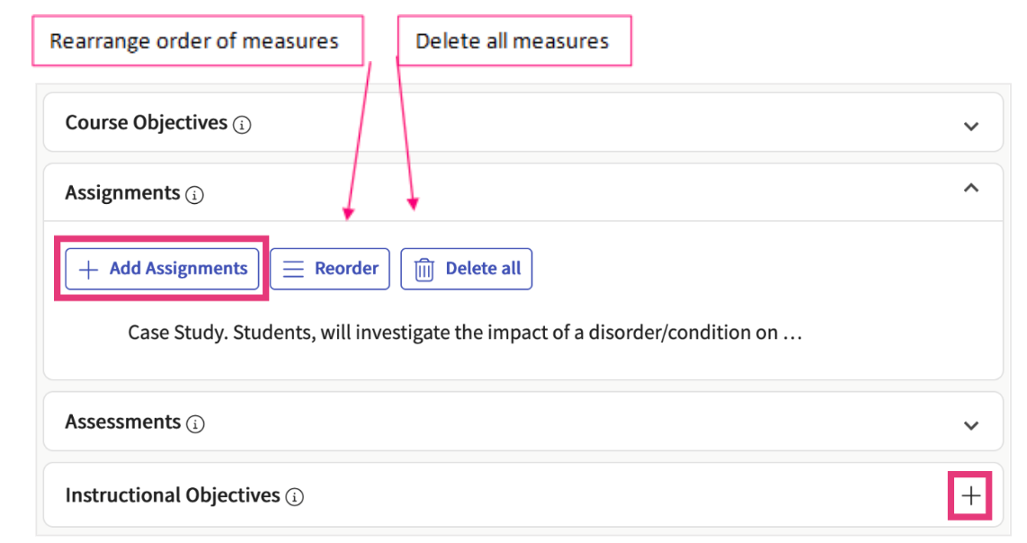 Measures are the components that build your courses I.e course objectives, instructional objectives, course learning outcomes, course goals etc. You can add, edit and delete them directly in the system.