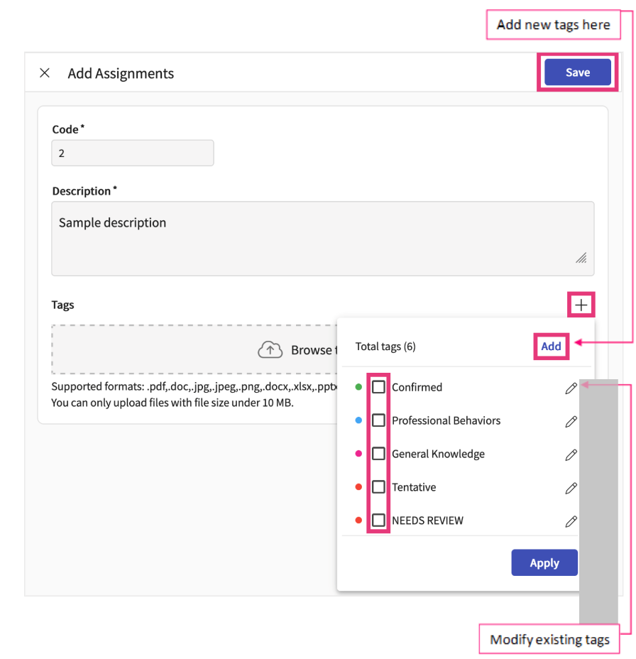 c. Tags: select from existing tags, or create new tags to easily filter through reports on items you may need (In progress, Needs Review, etc.)