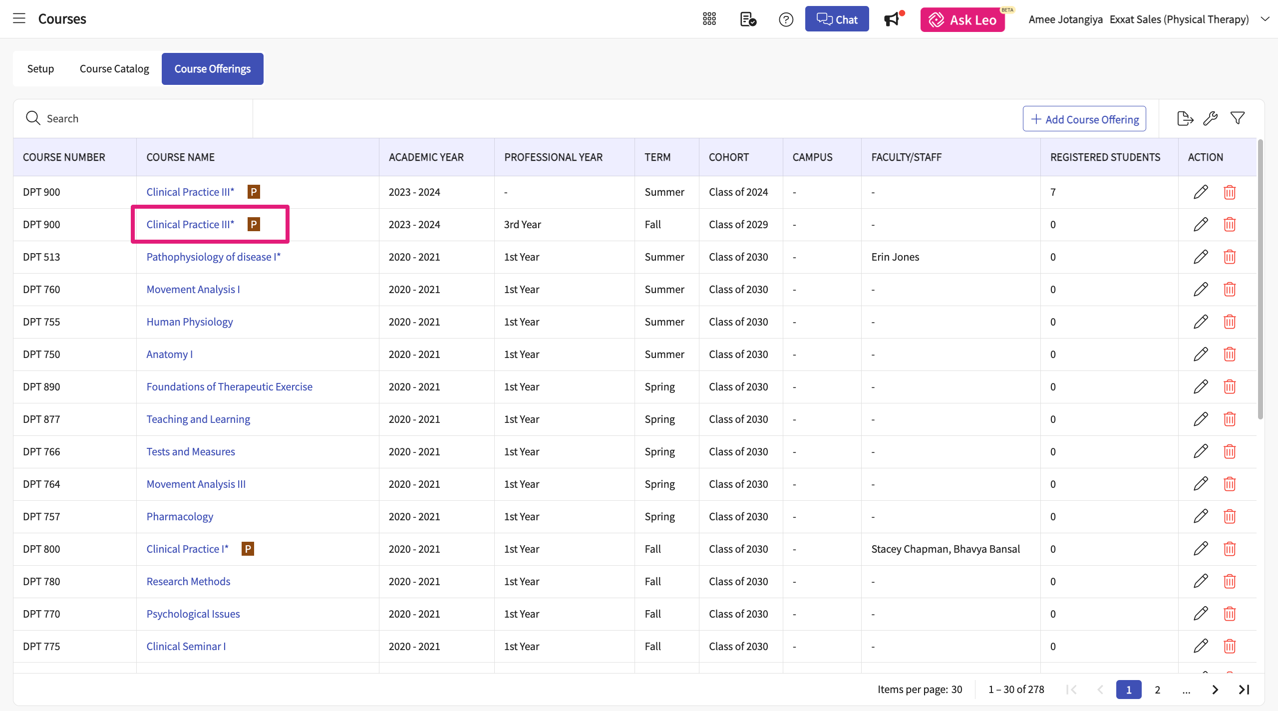 - On the Course Offerings page, find and select the course you’d like to manage.
