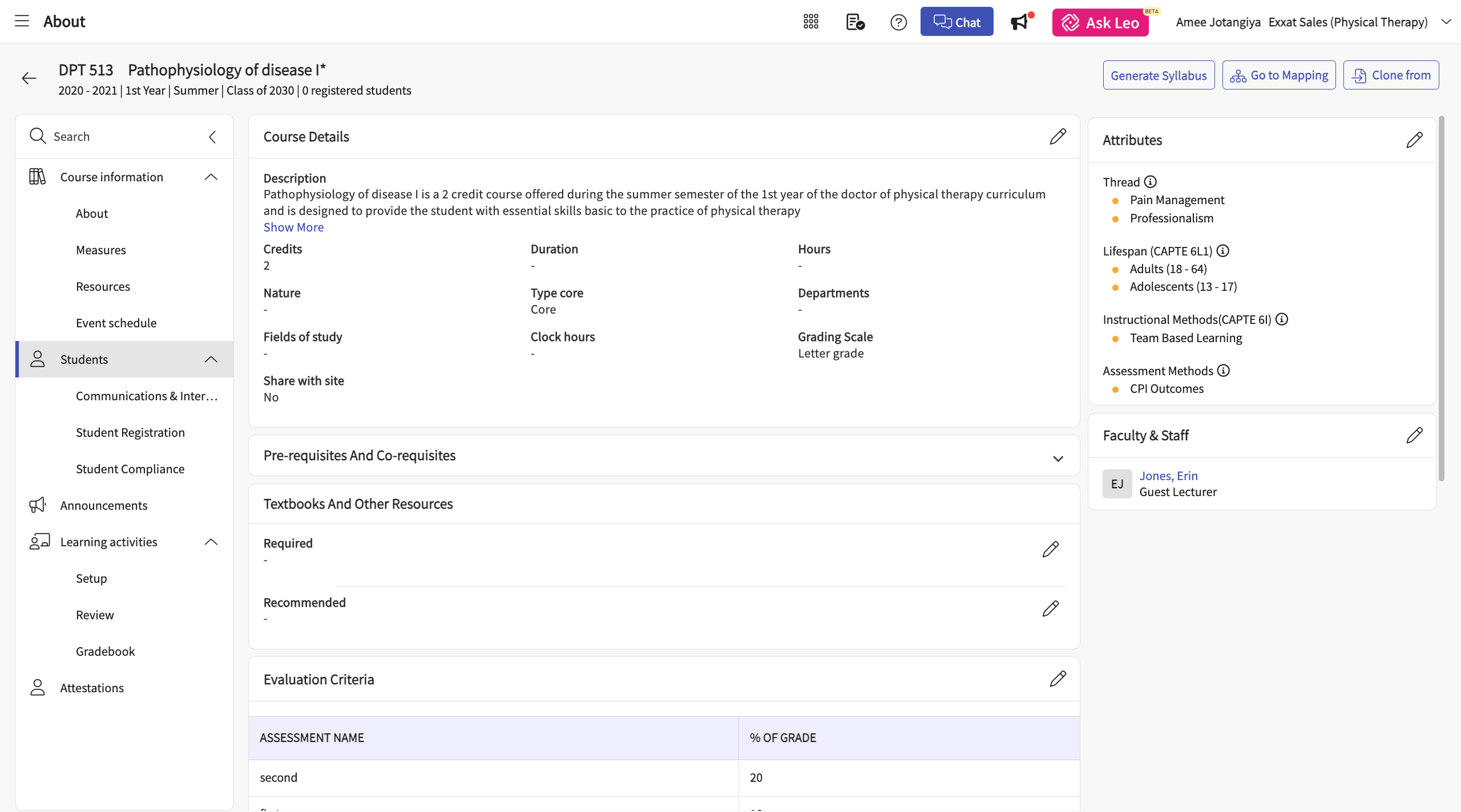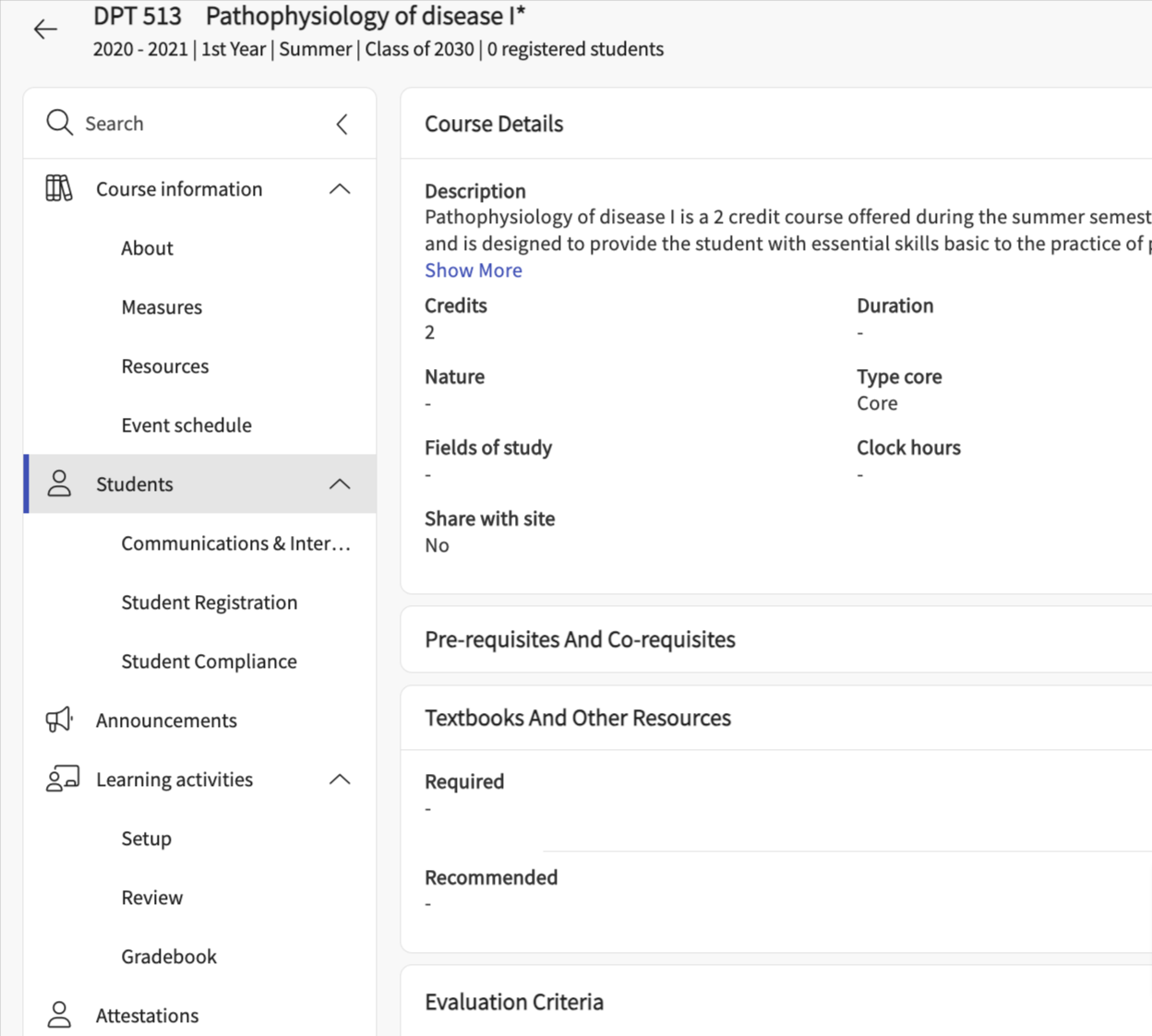 a. Any course offering that requires a placement will have a brown P icon. - Clicking on the name of any course takes you to the Course Details page which allows you to edit the learning objectives, schedule, pre-requisites, required materials, policies, grading scale, and more, simply click the name of the course. You also have access to viewing the students registered for a course as well as setting up and grading the assignments those students have completed. You can add "Attestions" to the course offering