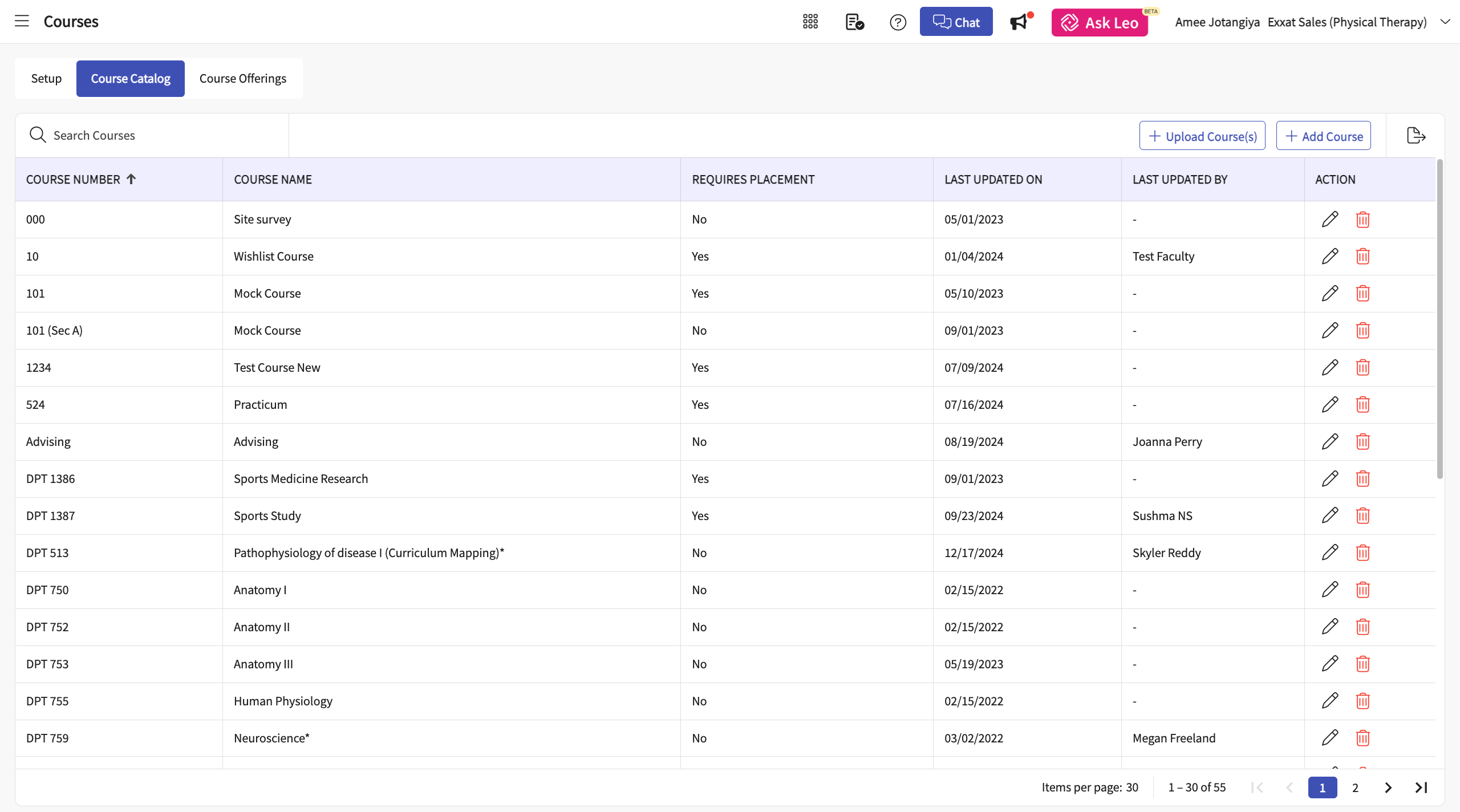 - The course catalog is a read-only section that provides you with information about courses, including the number, name, whether it requires a placement, and when it was last updated.