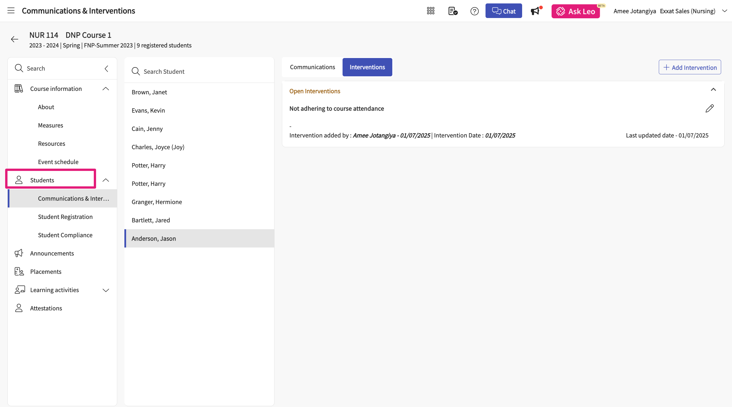 - Click on the Students section to manage students' communications and interventions, Student registrations, and Student compliance.