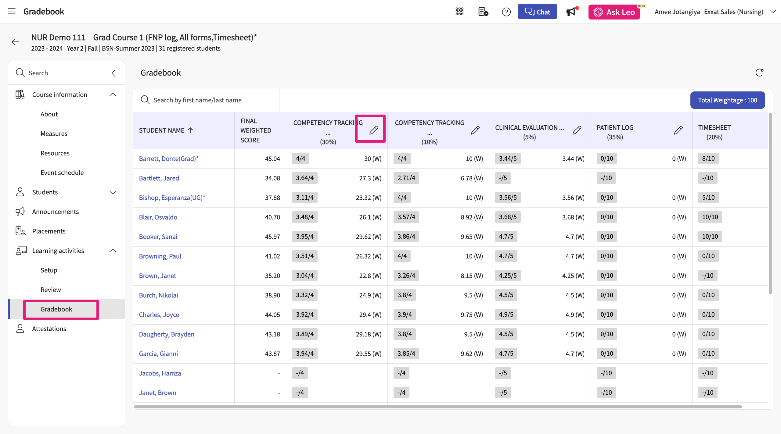 - Click on Gradebook to mange scores