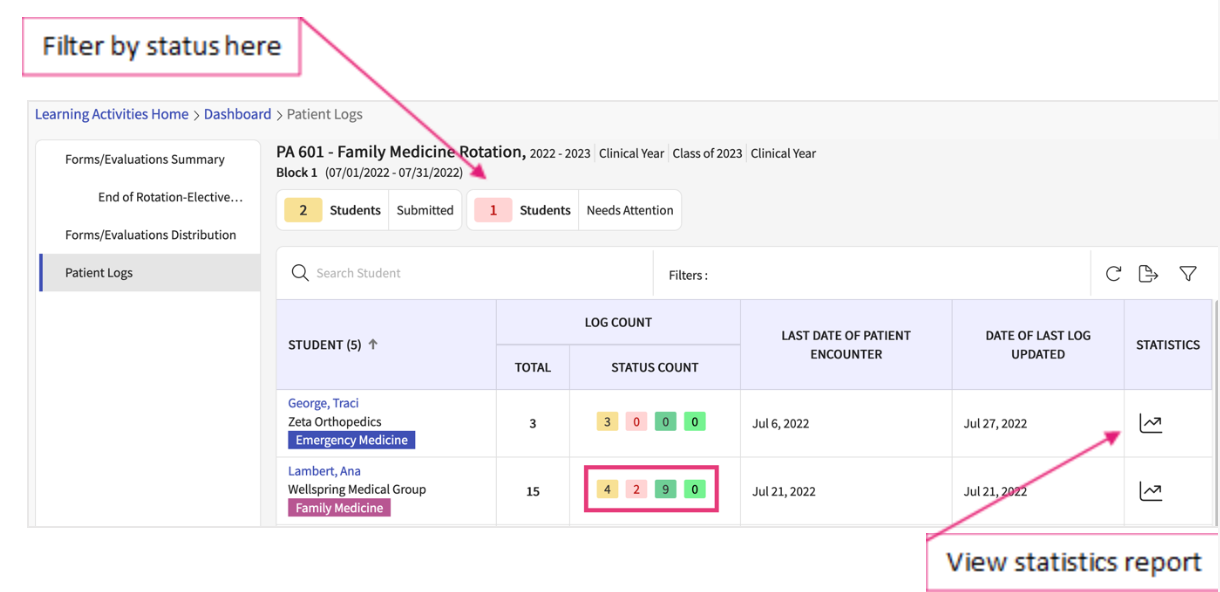 - You’ll be taken to the Patient Logs page, which will display all placed students and their current log count, a breakdown by status, and recent activity details.