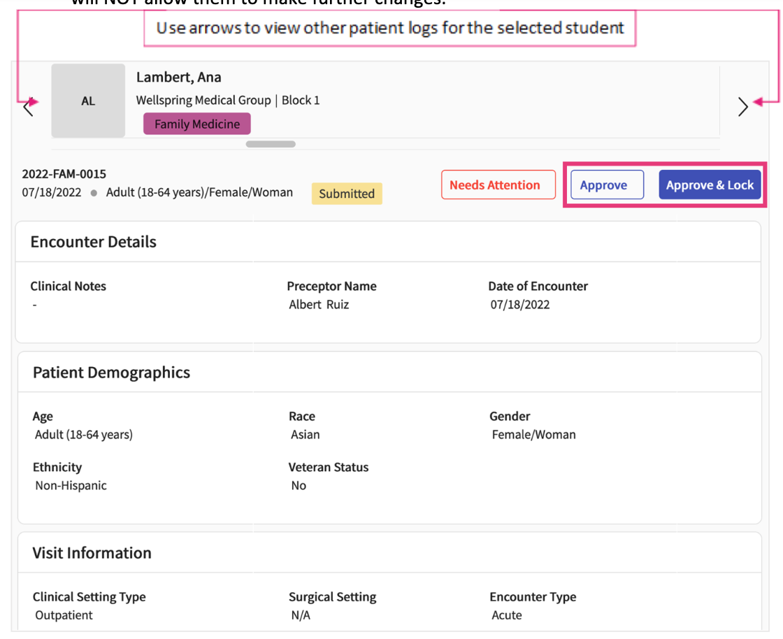 b. Approve & Lock the log: inform the student the log has been reviewed and will NOT allow them to make further changes. - If the form needs additional information or changes, provide feedback, and select Needs Attention.