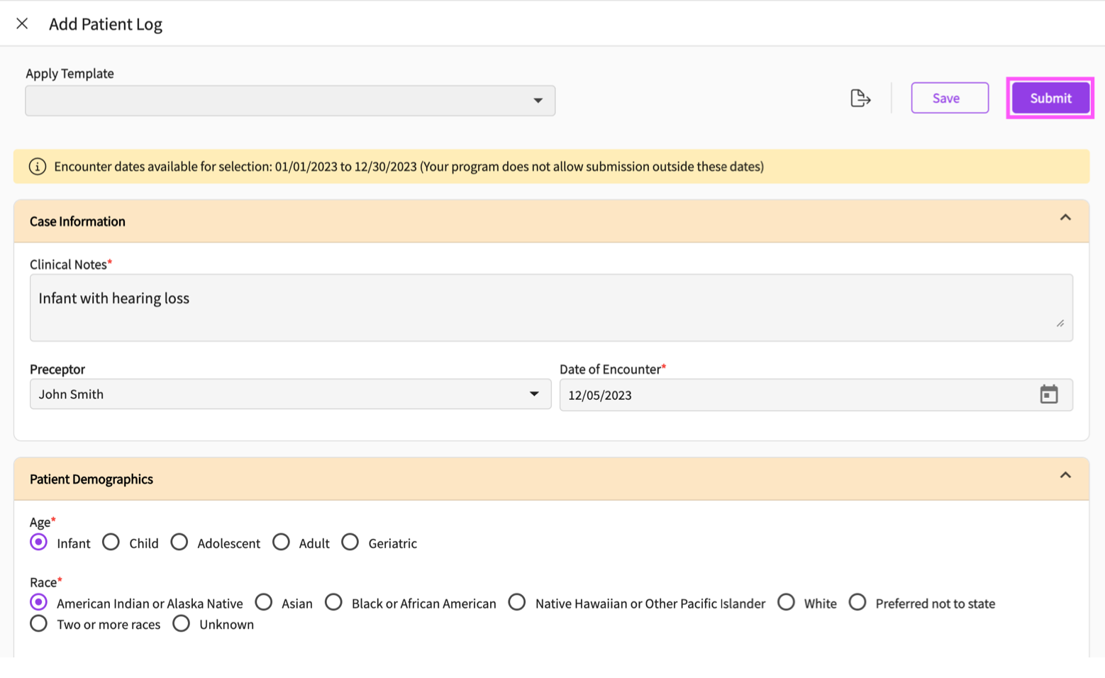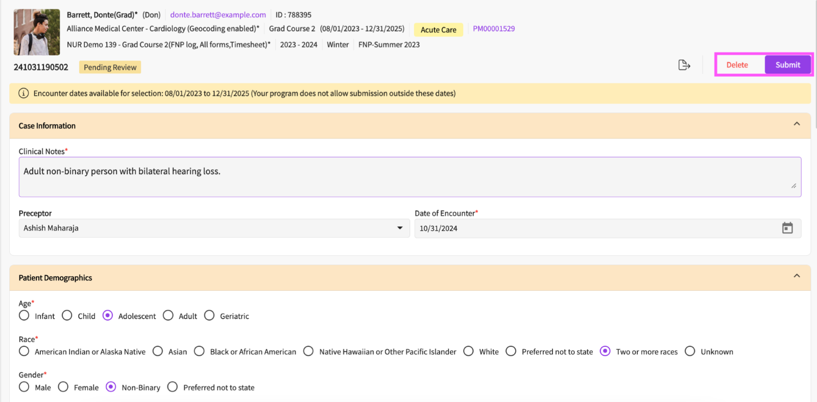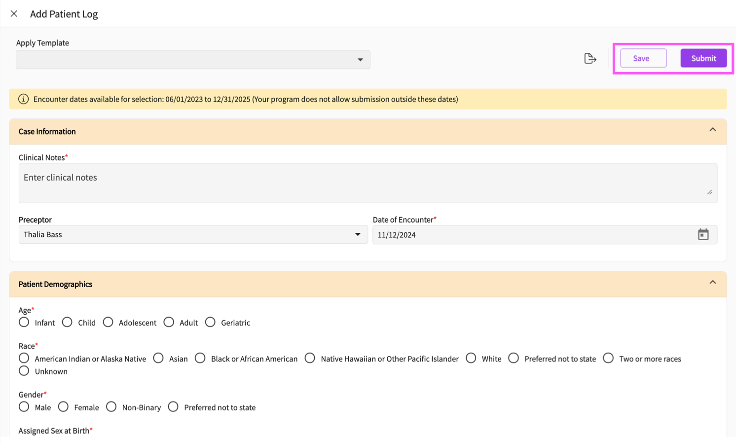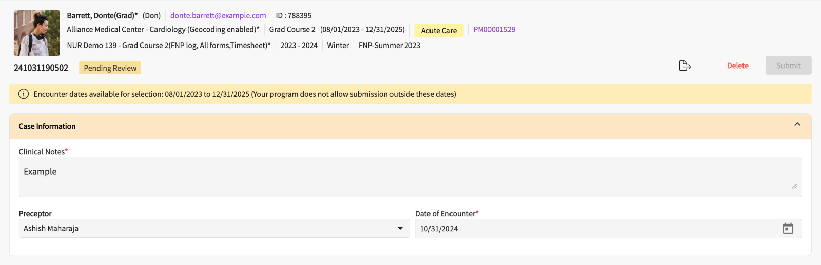Placement Dates: You can fill and submit your patient logs only within your placement start and end date window for the course. You cannot enter or submit patient logs for dates outside of the placement period. If you need to adjust your placement date window, please contact your school.