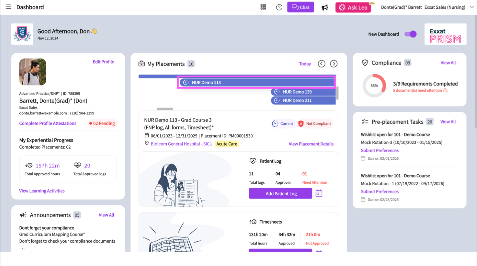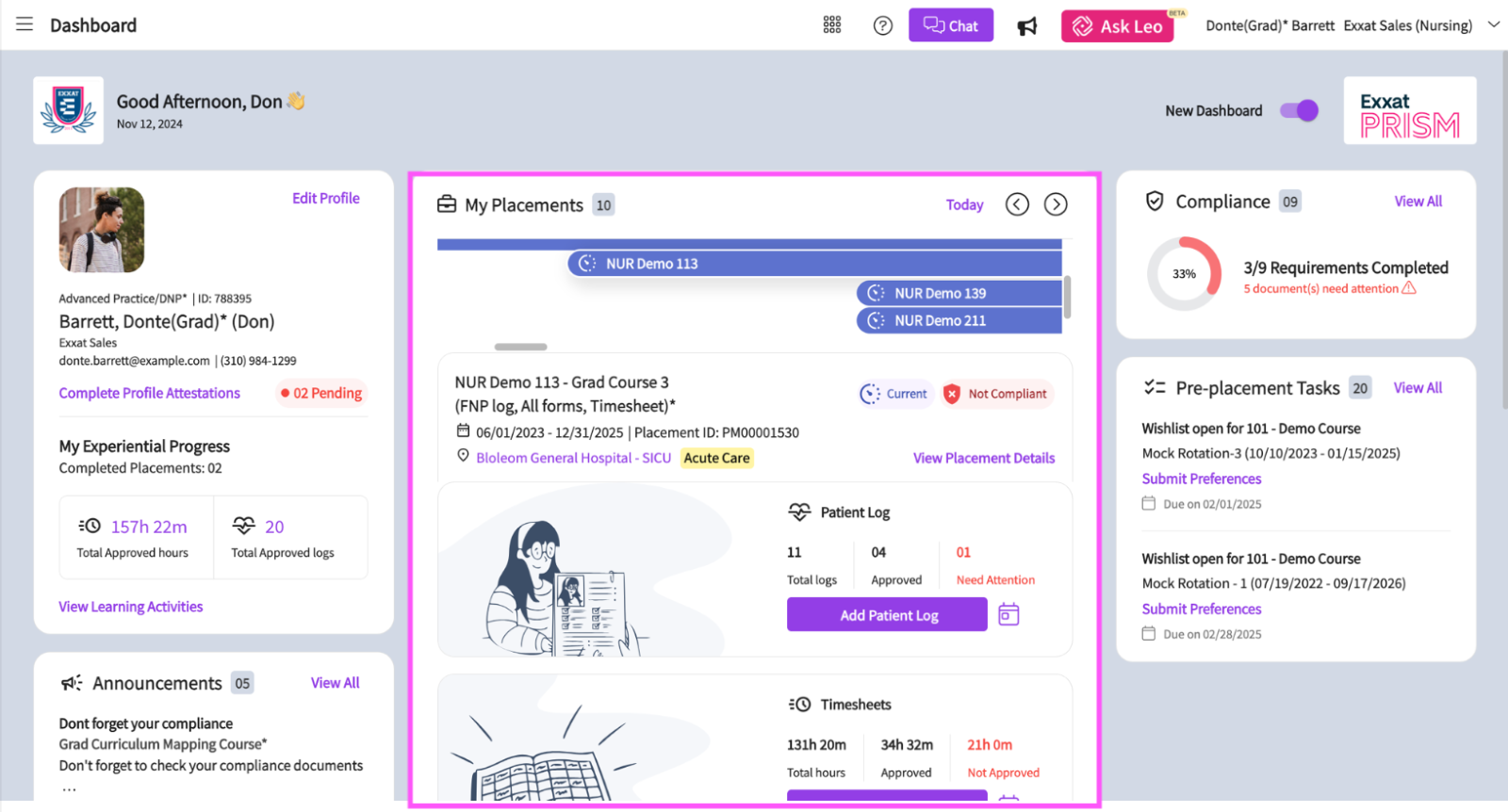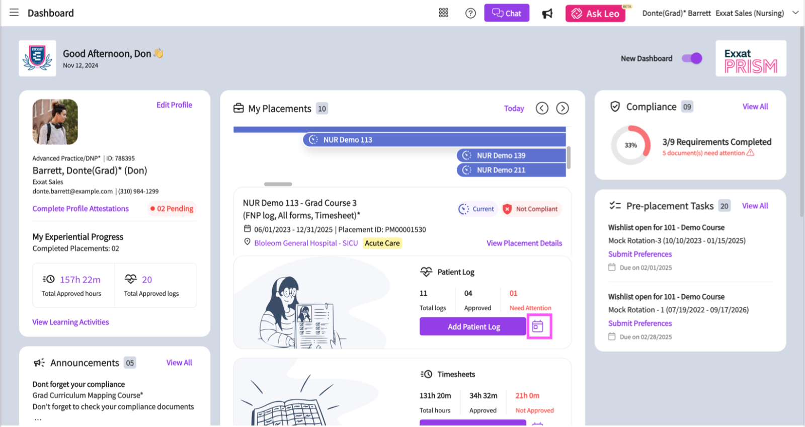 Placement Dates: You can fill and submit your patient logs only within your placement start and end date window for the course. You cannot enter or submit patient logs for dates outside of the placement period. If you need to adjust your placement date window, please contact your school.