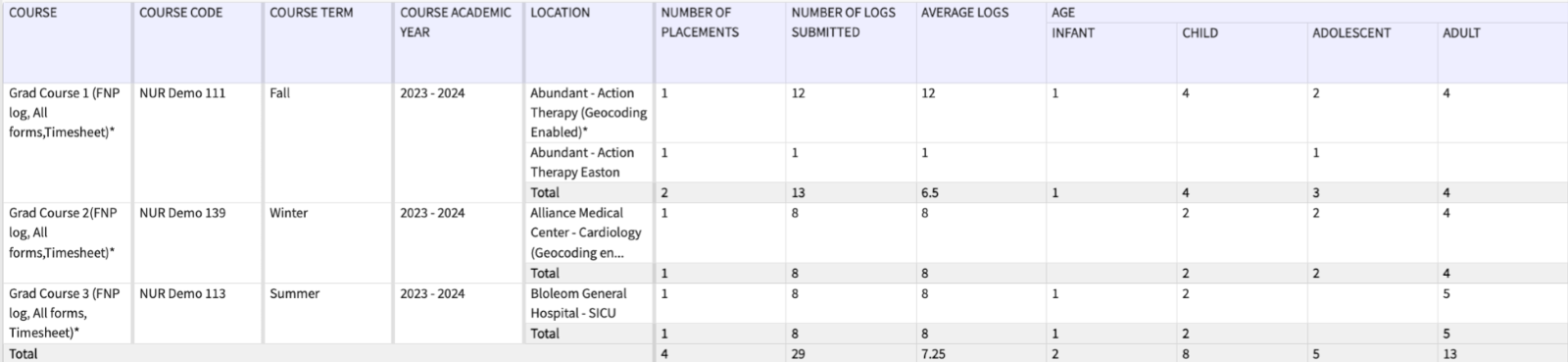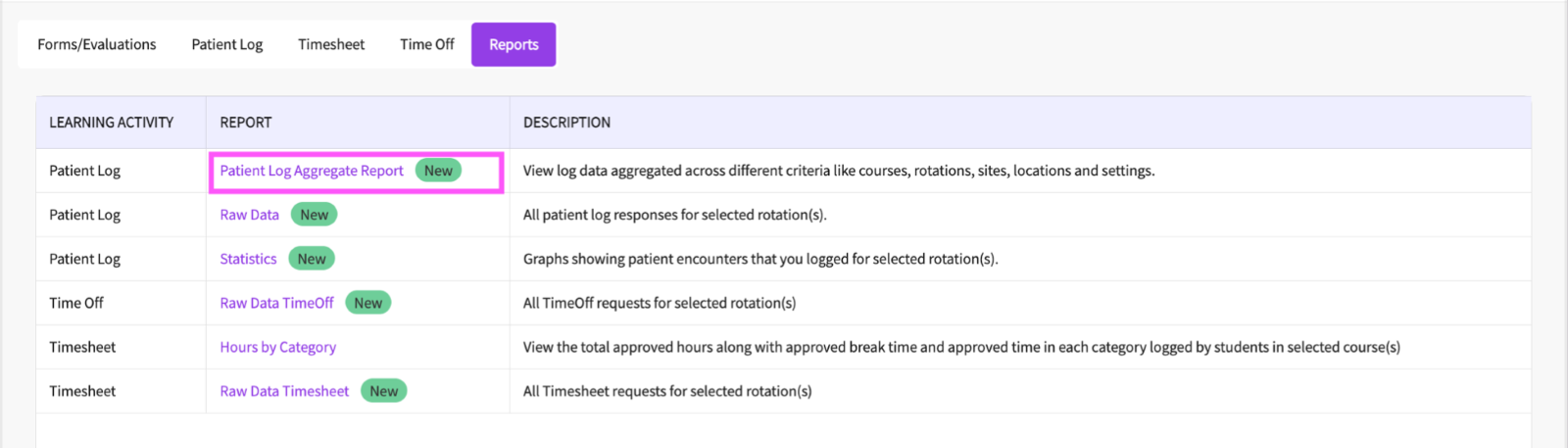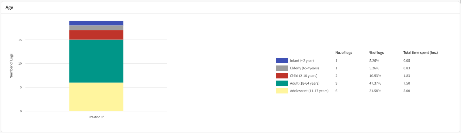 The patient log aggregate report aggregates your patient log data for you to ensure that you have enough clinical encounters to meet your graduation requirements.