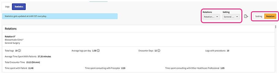 4. If you are placed multiple times in this course, you can use the rotations and settings dropdowns to filter the report by rotations or settings. You can also use the Setting or Rotation tabs to view segregate the graphs by setting or rotation.
