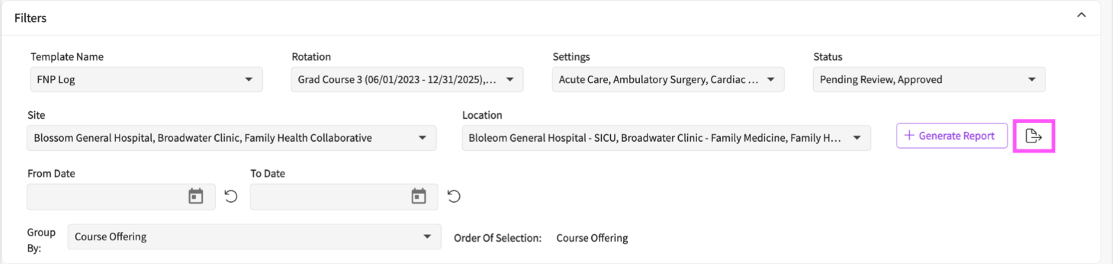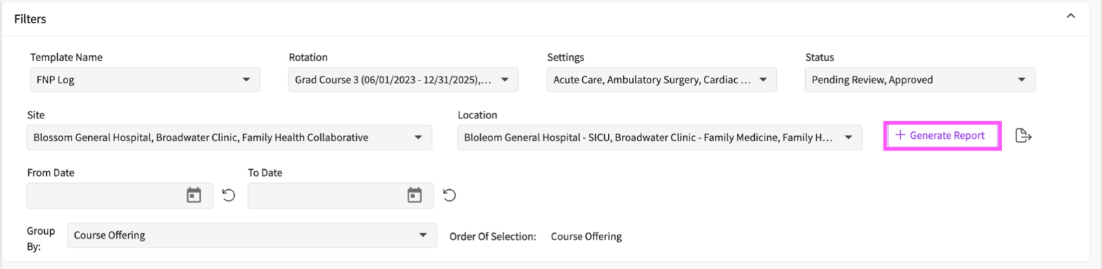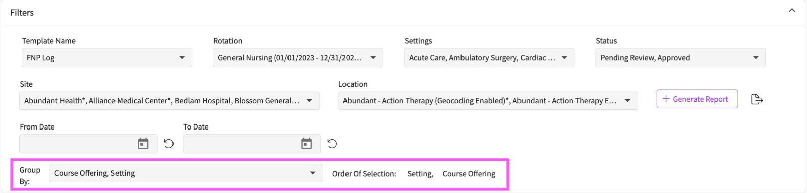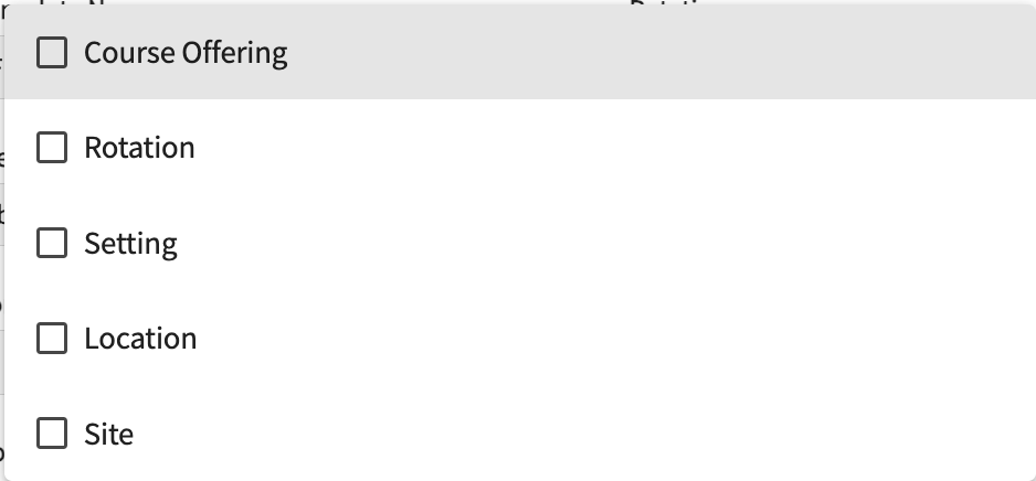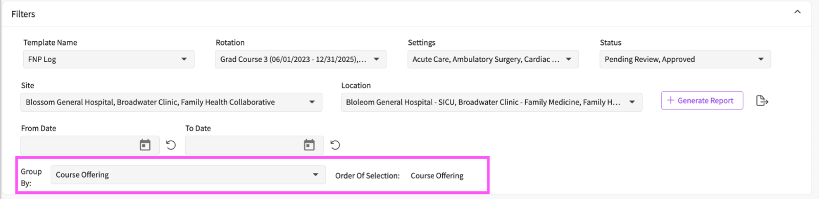 8. In the group by section, indicate how you would like to group the aggregation of data. You can aggregate your data by Course offering, Rotation, Setting, Location or Site.