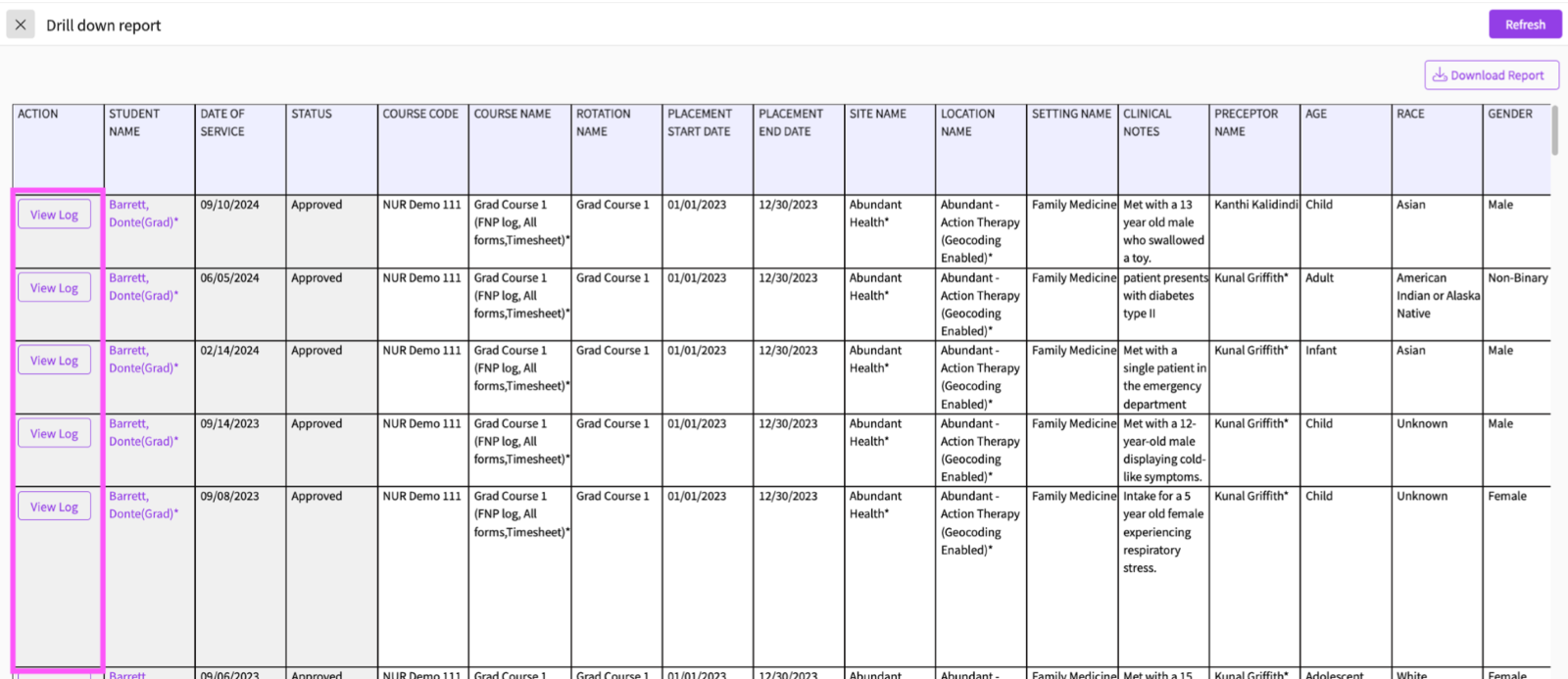 13. Click on any of the boxes within the table to view a drill down report which displays the patient logs where this option was selected, or the time was indicated. You can view the placement information for the course to which the log was added and the log itself. Click on the download report button to download this report for offline access.