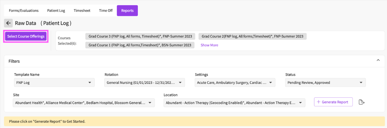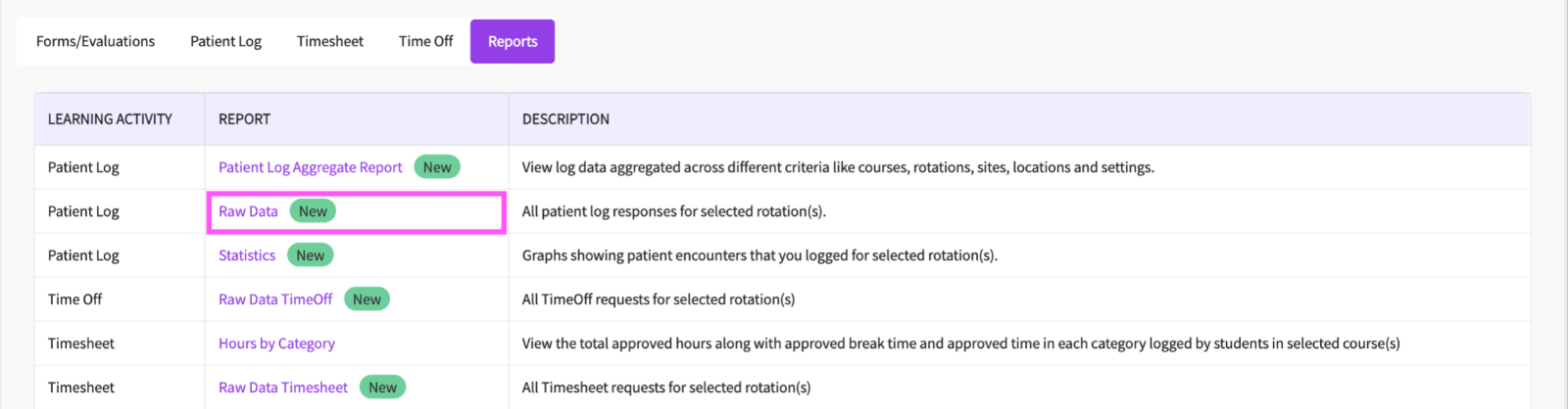 1. Navigate to the Reports tab of the Learning Activities section. And click on the Patient Log Raw Data Report.