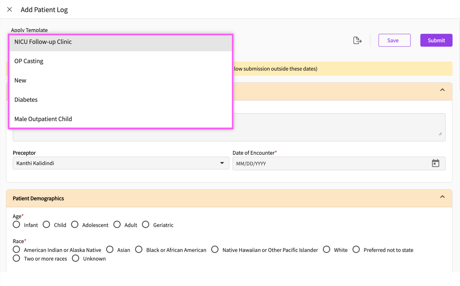 12. To apply a template to the patient log entry, click on the Apply Template dropdown and select a template the common information will then be applied to your patient log.