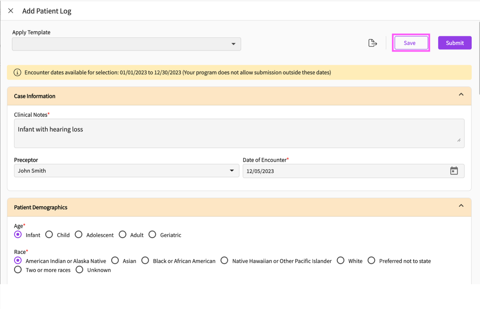 8. You can then view and make changes to this patient log. Be sure to save or submit once you are finished.