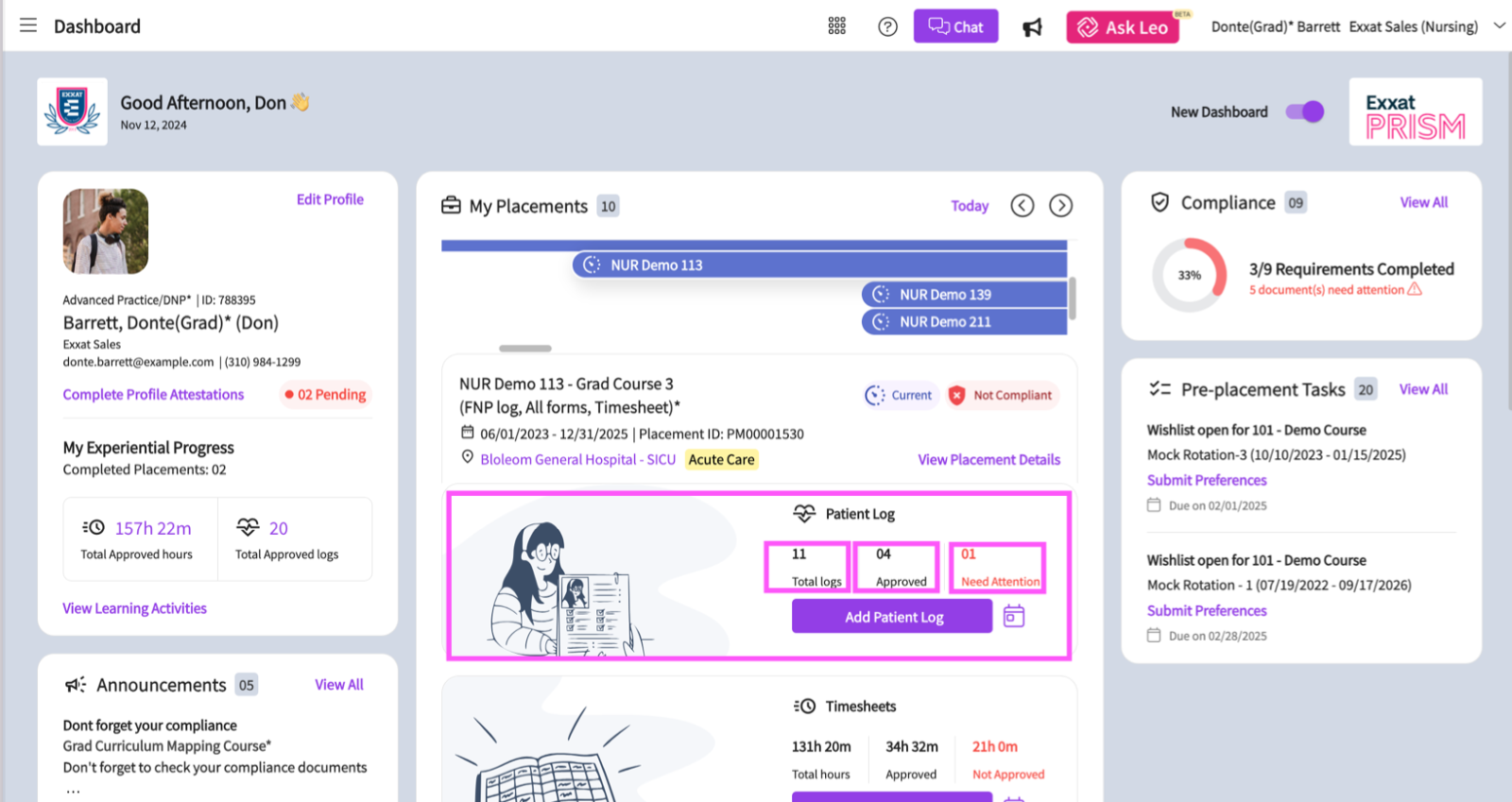 Patient logging is an essential aspect of clinical education, providing a detailed record of your interactions with patients. This guide outlines how to log patient encounters using the Exxat Prism system. It covers how to access coursework, select placements, add new logs, and run reports to ensure you are meeting patient log program requirements. The guide also explains how to handle logs that require your attention after your school or experiential supervisor reviews them. Additionally, this guide provides solutions to common issues you may face when logging patient encounters.