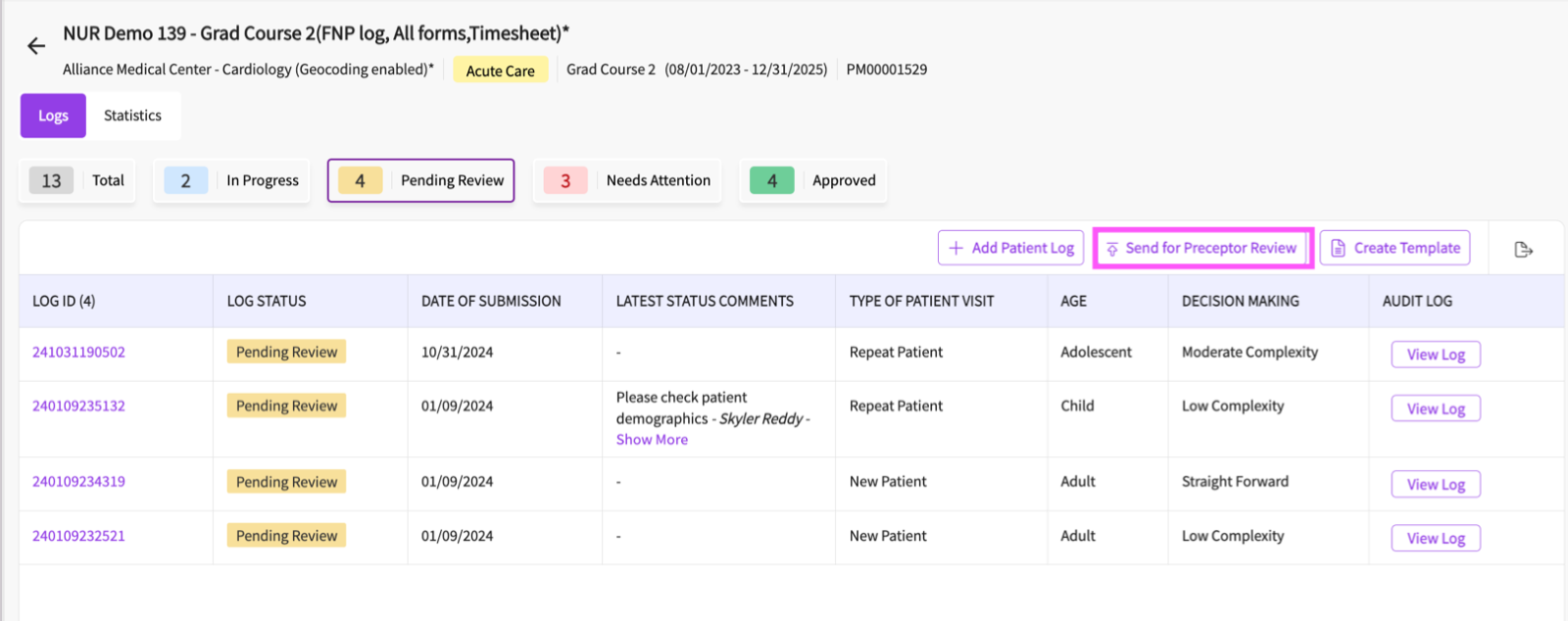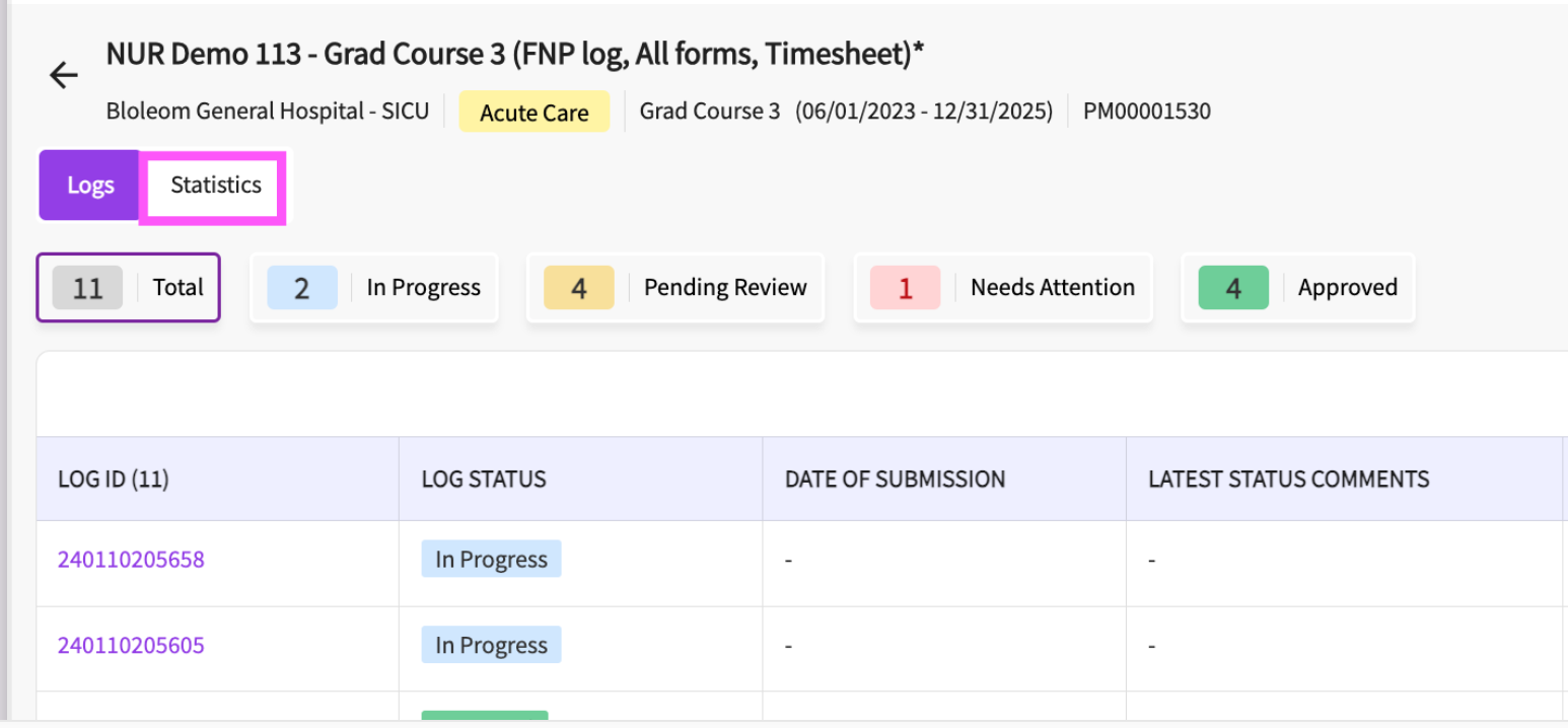 3. Scroll down to the patient logs section. In this section you can view the total number of logs submitted, the number of approved logs, and the number of needs attention patient logs in this course.