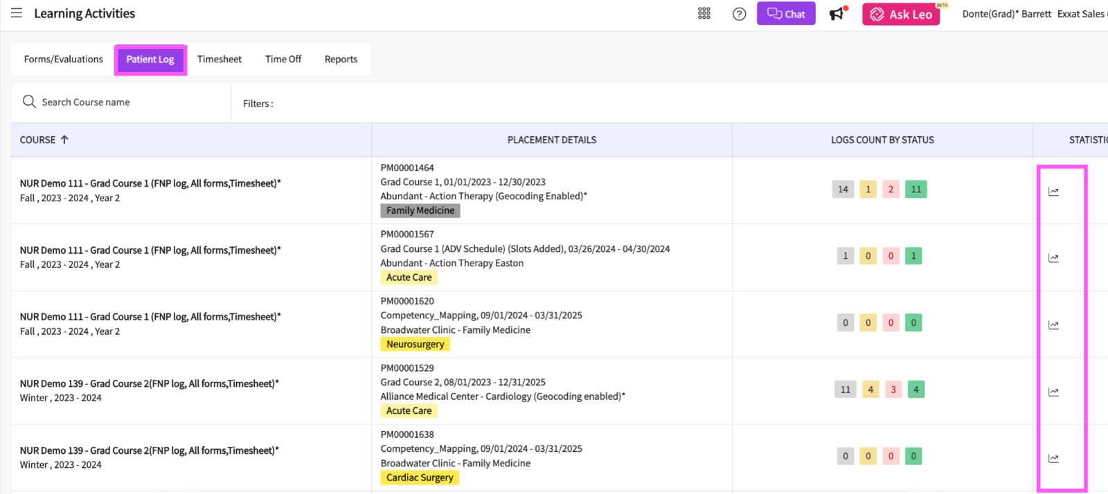 c. From the patient log tab of the learning activities section, click on the statistics icon in the statistics column.