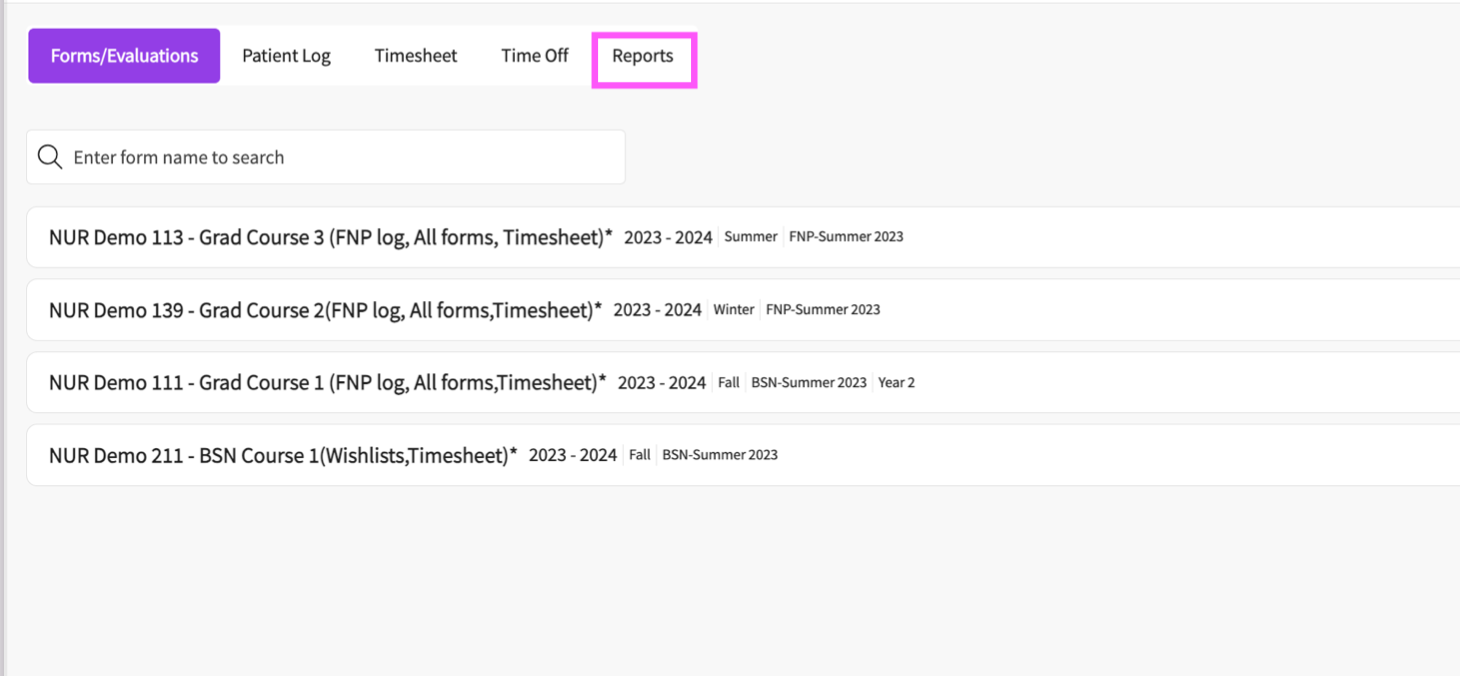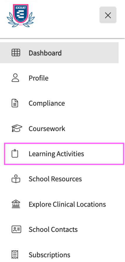 1. To run the clinical log aggregate report, navigate to the learning activities section from your left-hand menu and select the reports tab.