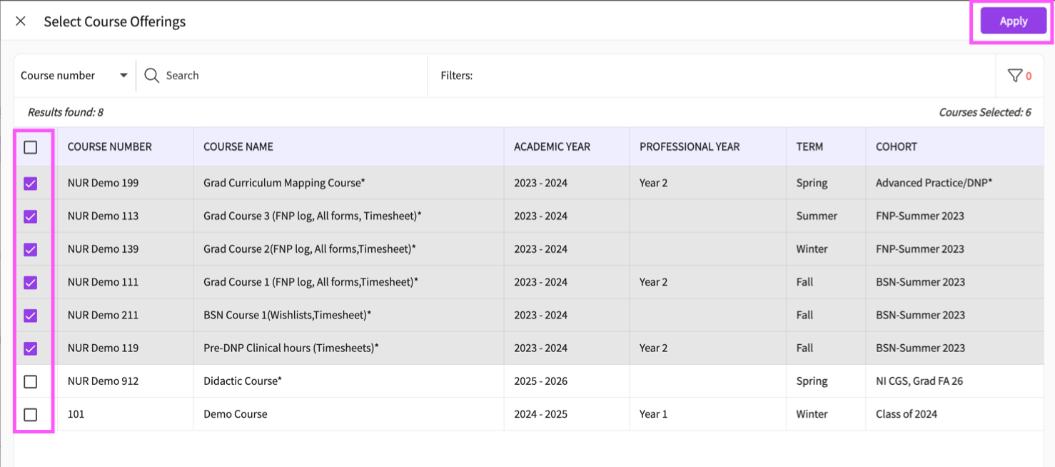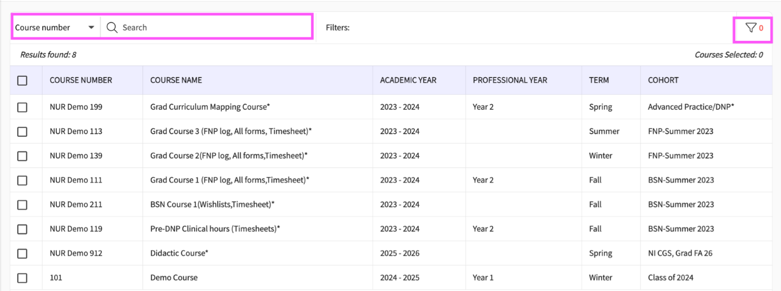 4. You can use the search box or filter icon to search for specific course offerings. You can also change the type of the search box using the dropdown to the left of it.