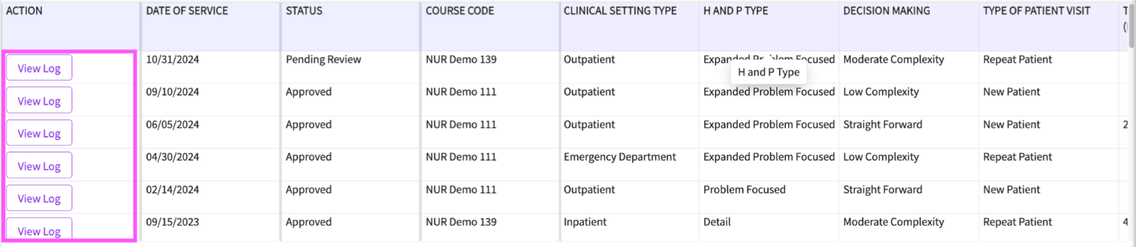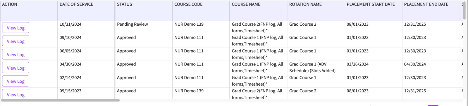 5. In the report below there will be a row for each log entry. You can view the date indicated on the log, the log status, course for which the log was added, placement information, and the patient log information. You can scroll right to view all the options selected on each clinical log.