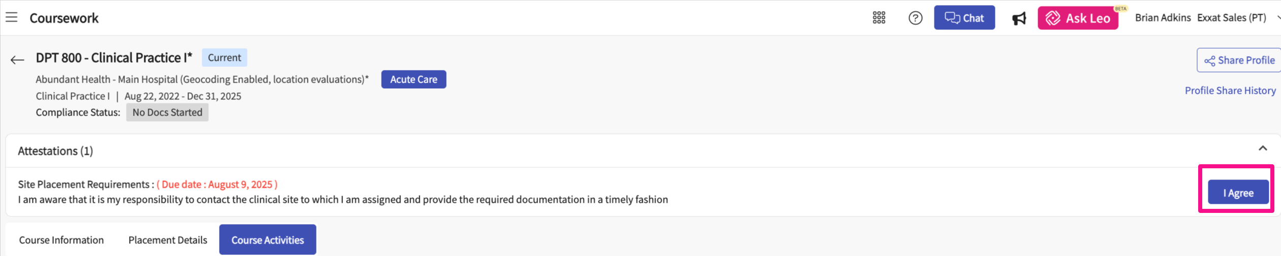 9. Click the Attestation drop-down to view all the attestations for your course. Click I Agree to accept the attestation required for your course.