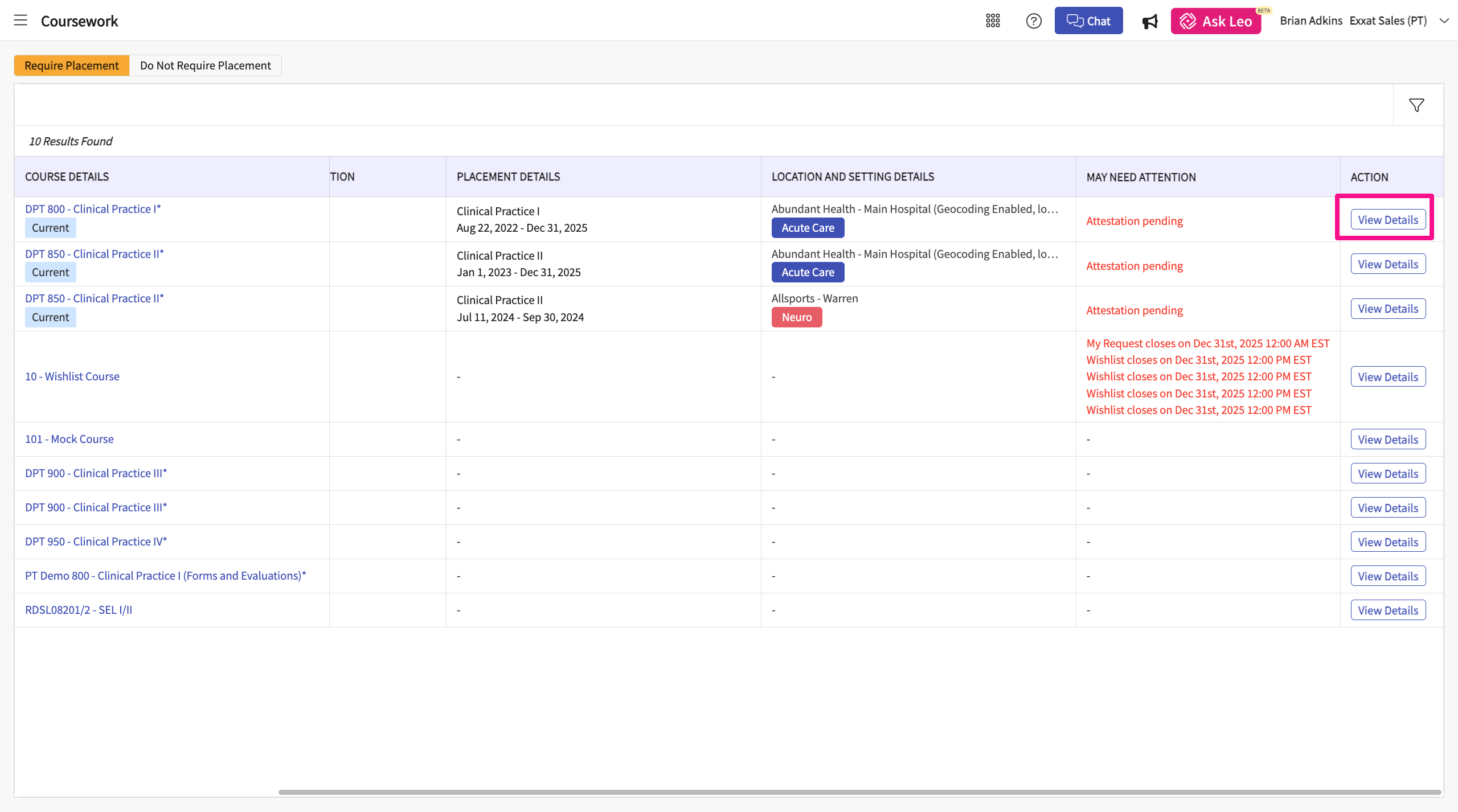 10. If your program will collect your preferences for a placement, you can easily identify a wishlist made available to you by the text “Wishlist closes on…” in the Needs Attention column under the coursework.