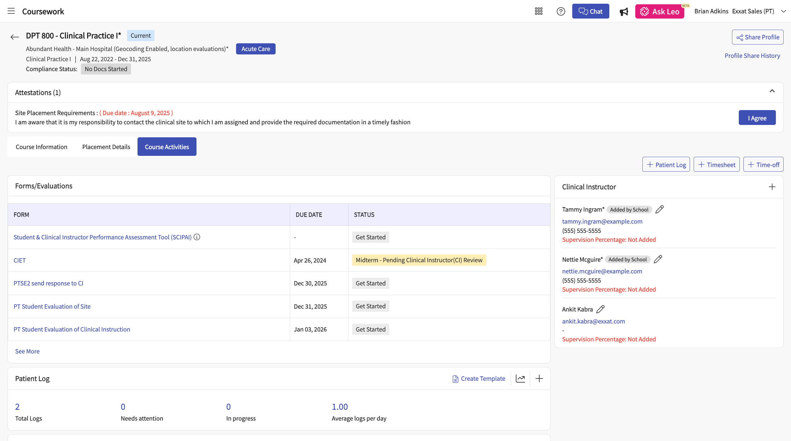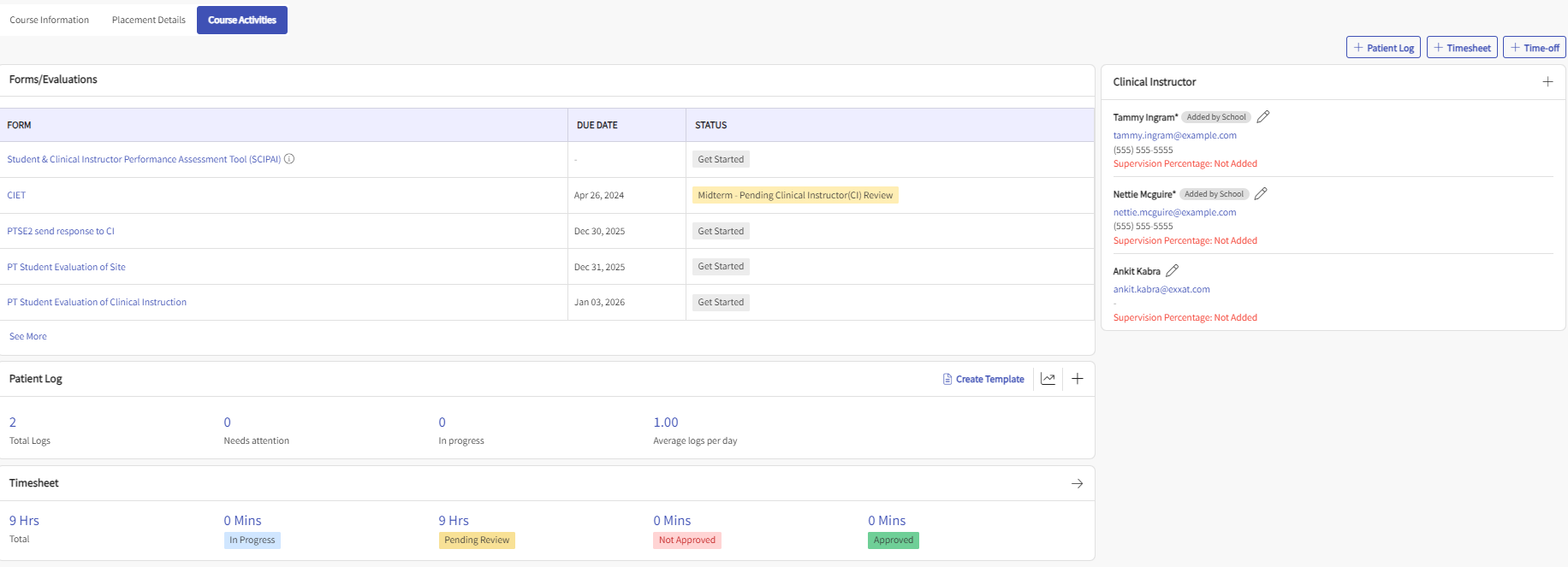 This page contains various components of placements including dates, attestations, forms, patient log, evaluator details, etc.