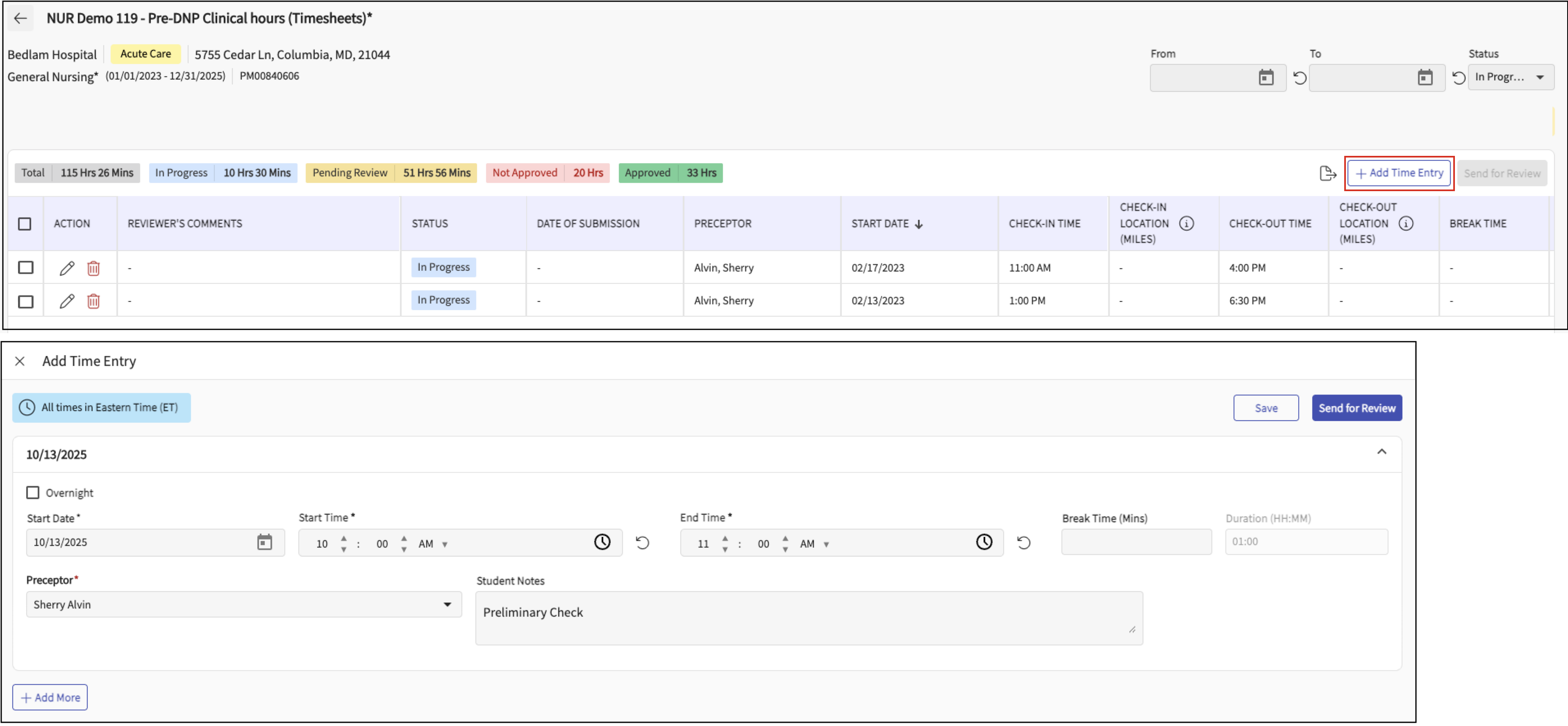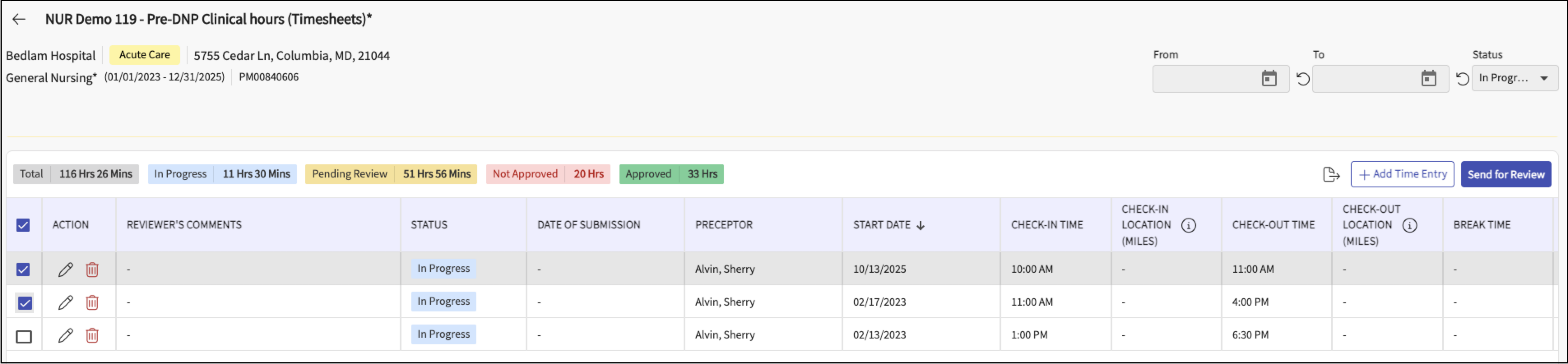 - Submitting and editing entries based on their status (In Progress, Pending Review, Approved, Not Approved).