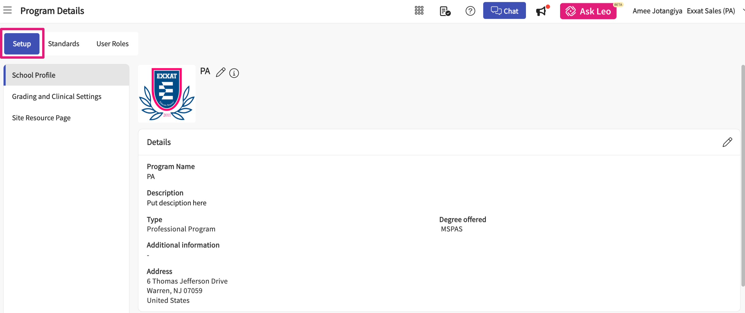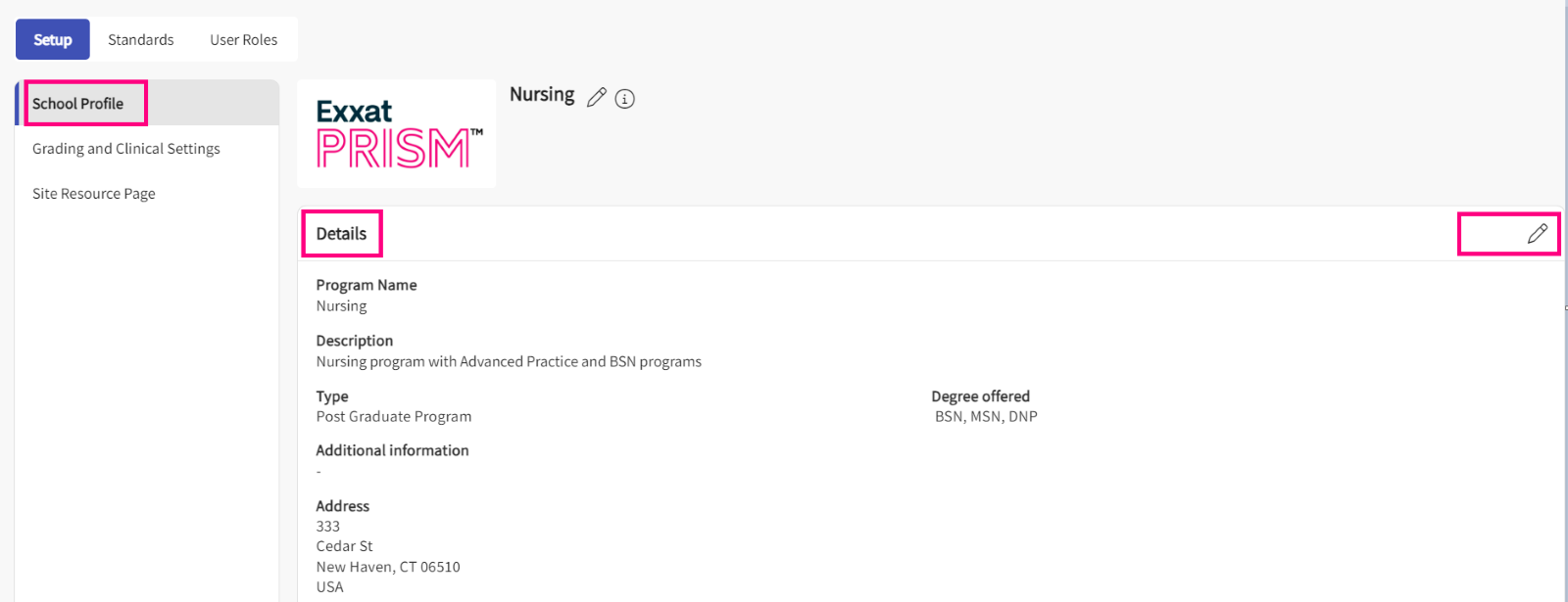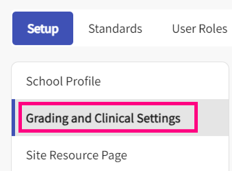 - Select Setup from Program Details to be taken to the Setup page where you will be able to view and manage the school profile, grading, and clinical settings and set up the site resource page.