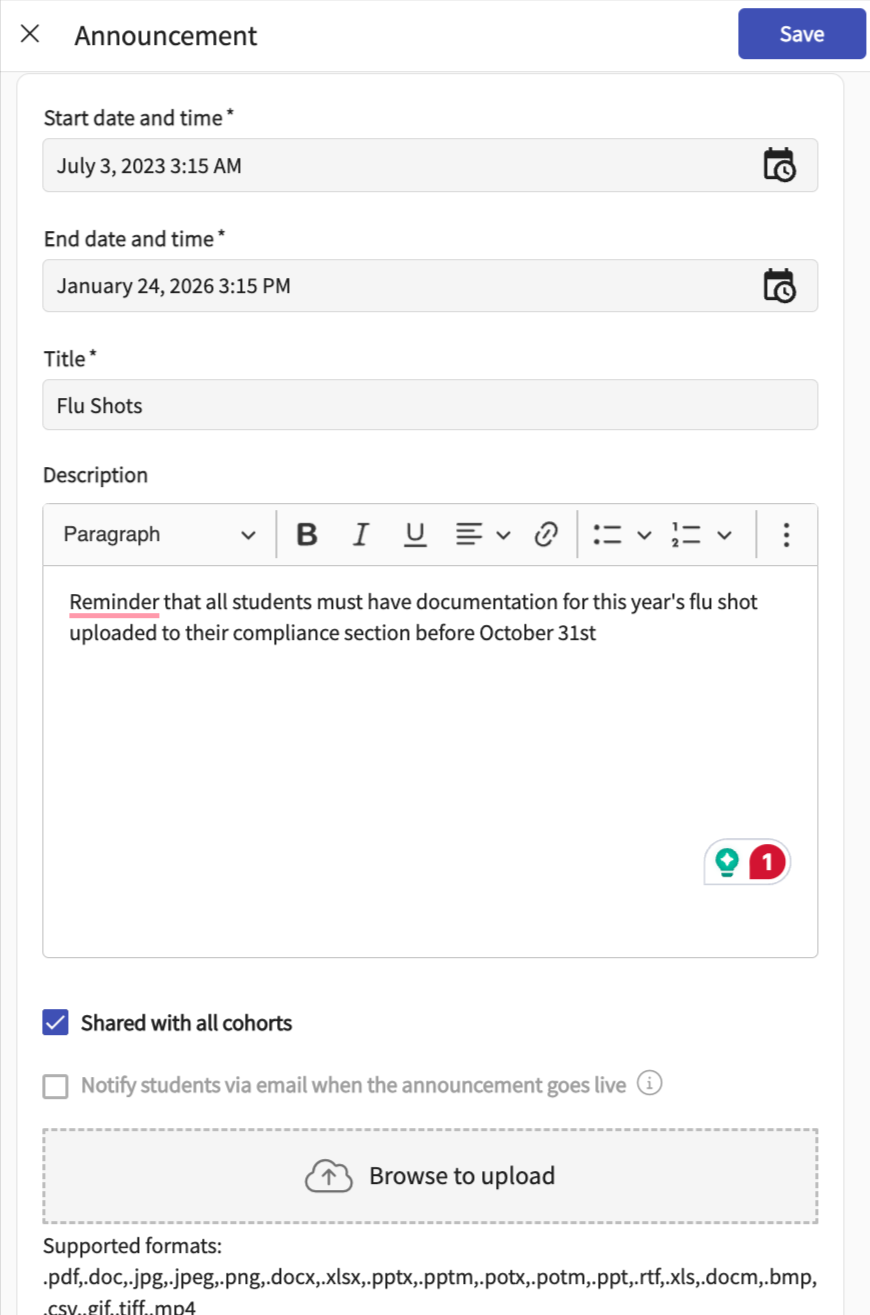 e. Shared with all cohorts: the system will always set an announcement to be shared with all cohorts by default. If the content is cohort specific, unselect the option. You will then have the ability to choose a specific cohort.