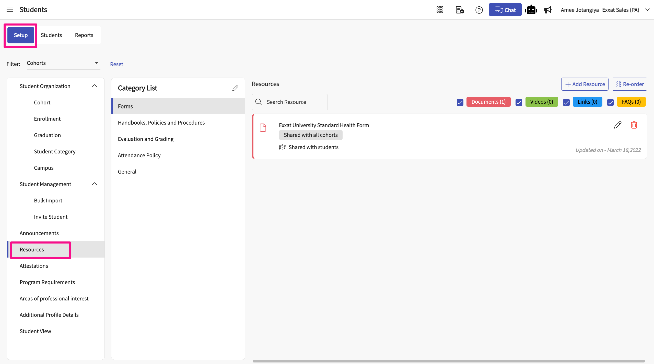 e. Shared with all cohorts: the system will always set a resource to be shared with all cohorts by default. If the content is cohort specific, unselect the option. You will then have the ability to choose a specific cohort. - You may want to organize the order in which your resources appear. To do so, select Re-order.