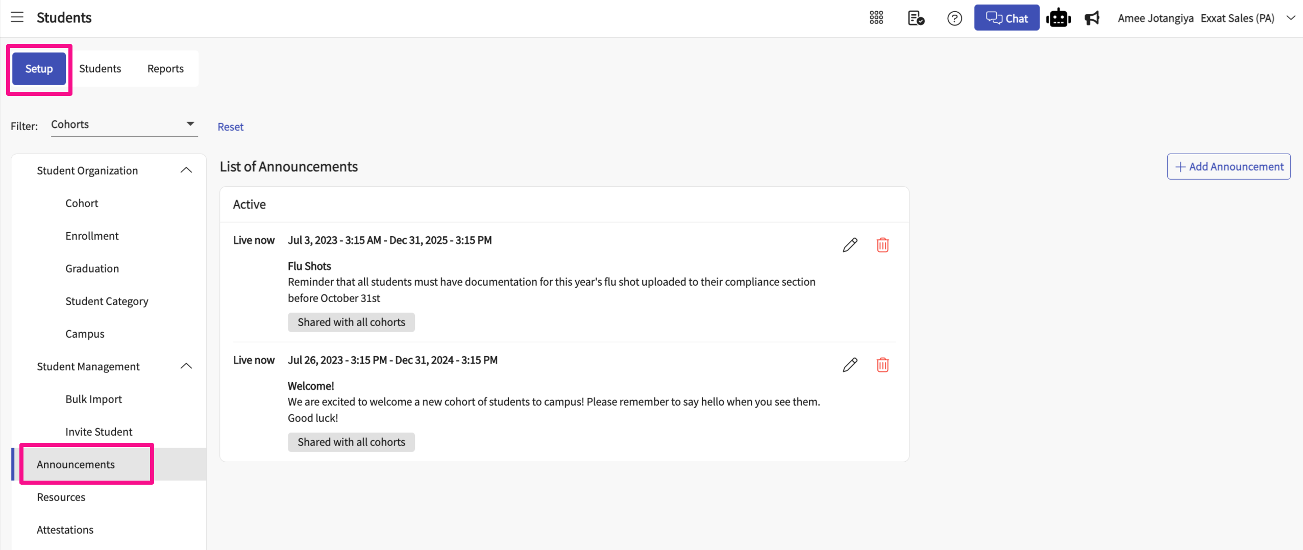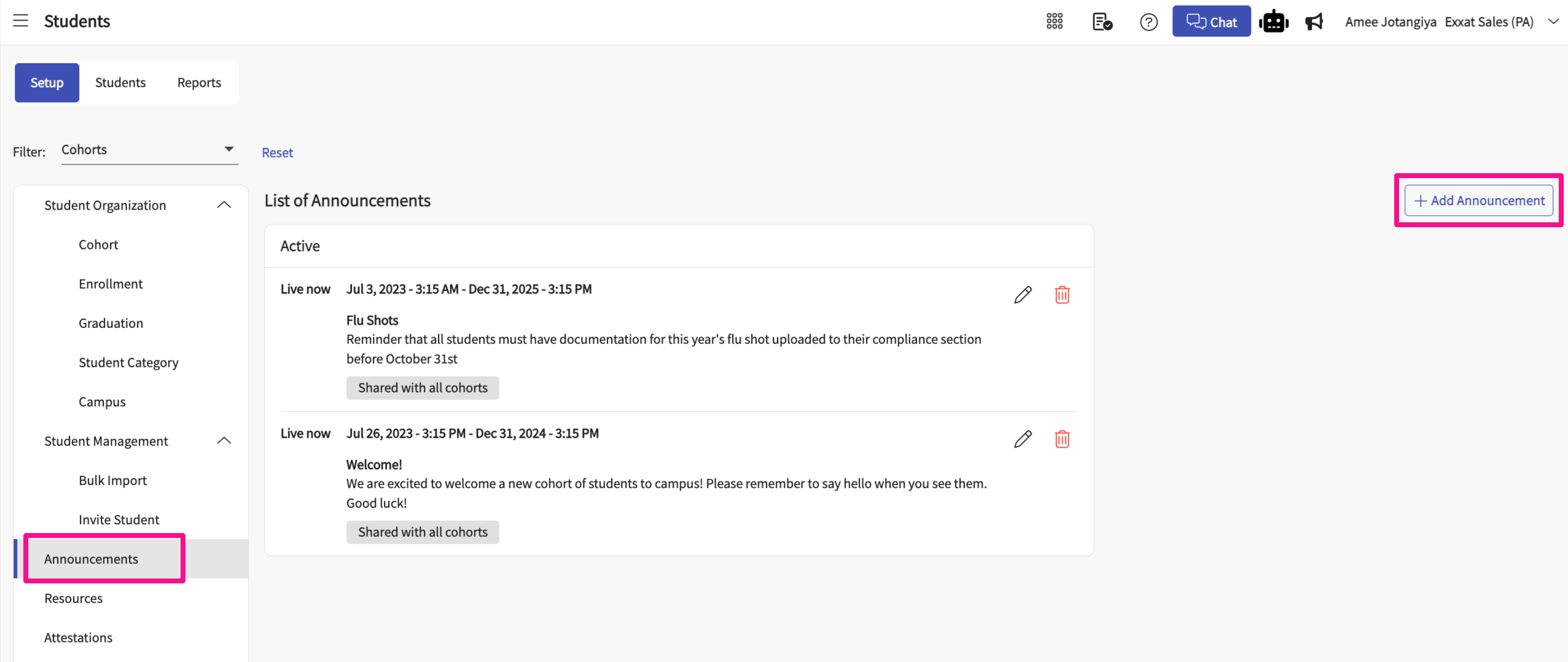 - Select Announcements. The system will load all announcements created previously. To view announcements for a specific cohort, use the filter option.