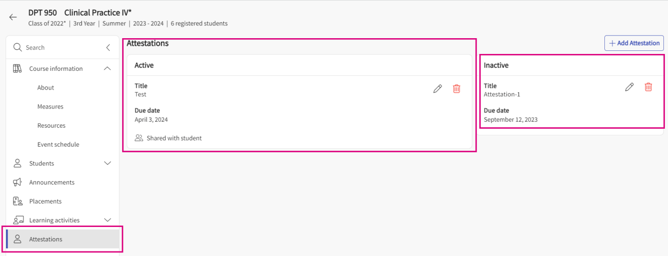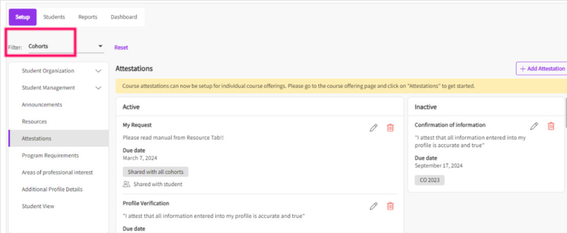 Please note: Once the attestations are attested by a student, you will not be able to edit the title, content, and cohort for the student.