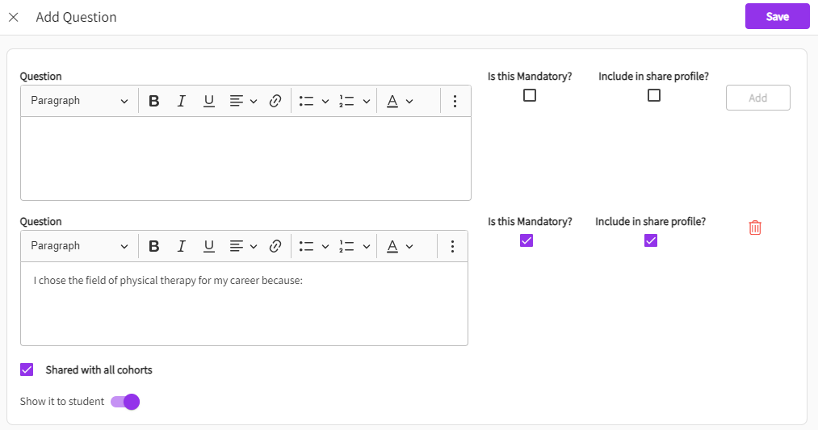 a. If the question is cohort specific, uncheck the box and select the desired cohort. - Once, you’ve added all necessary questions, click Save.