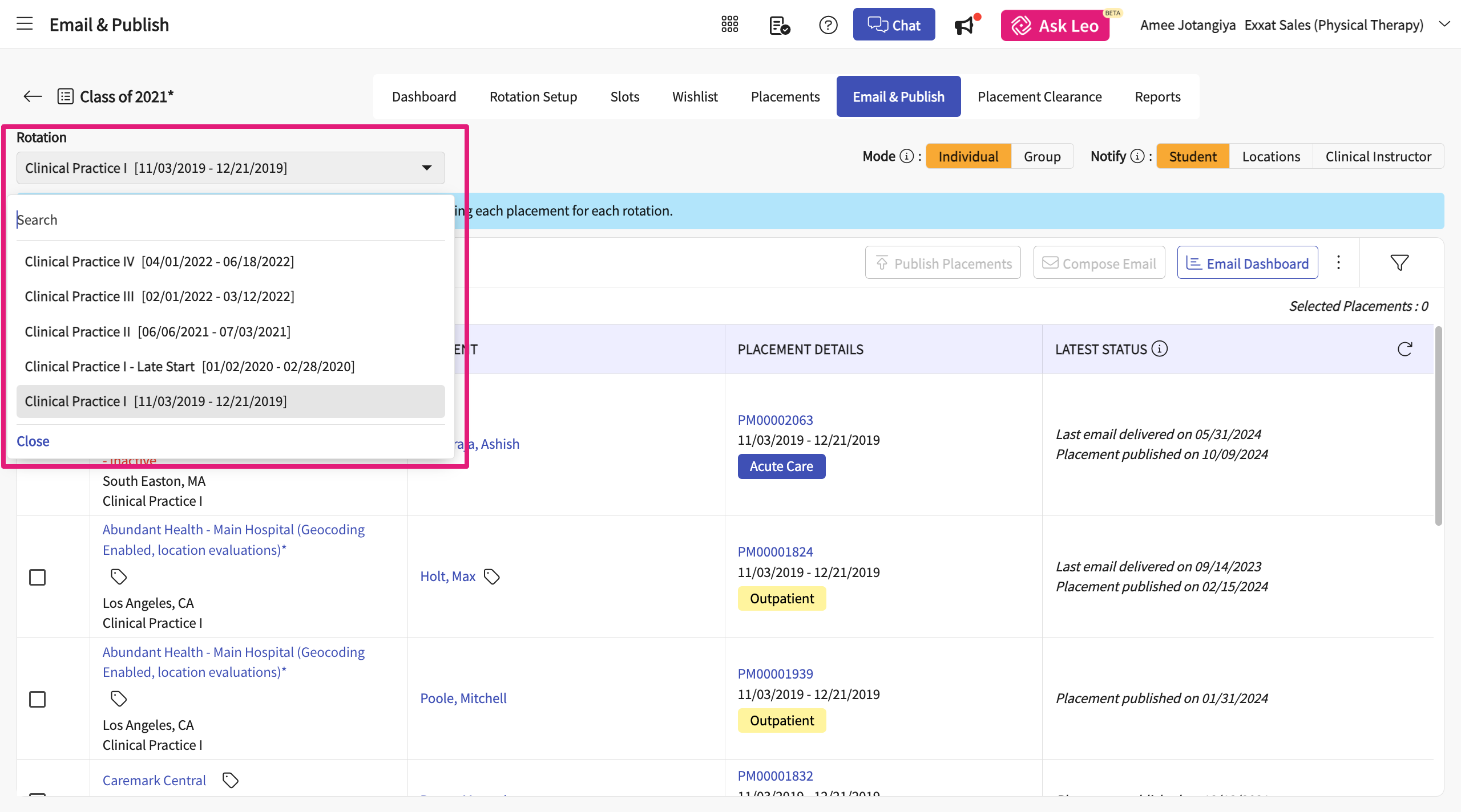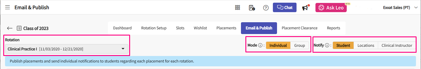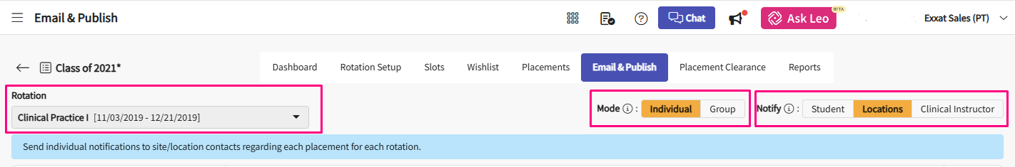 - Select the Email & Publish tab and select the rotation you would like to send notifications for, then select the Mode as 'Individual' & Notify as Clinical Instructor.