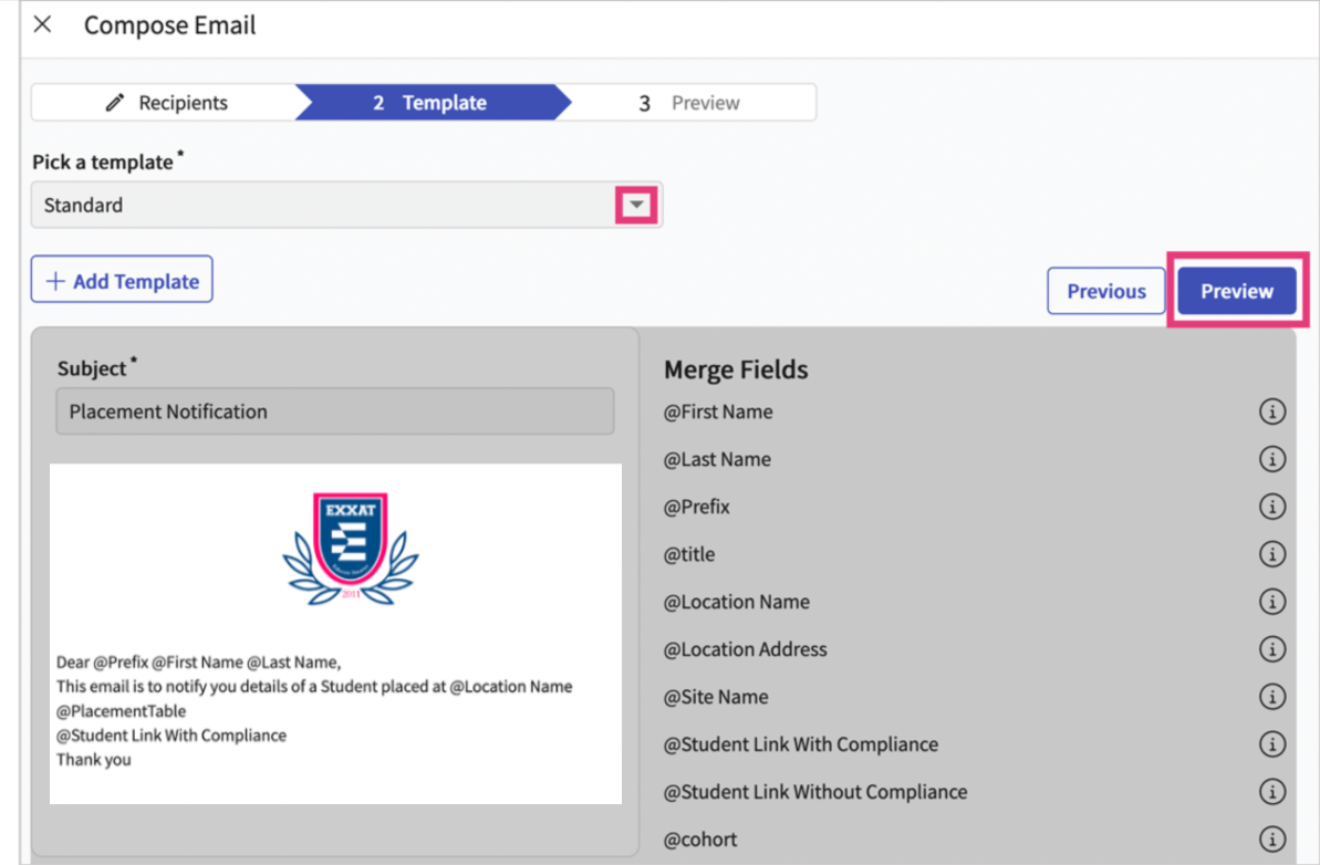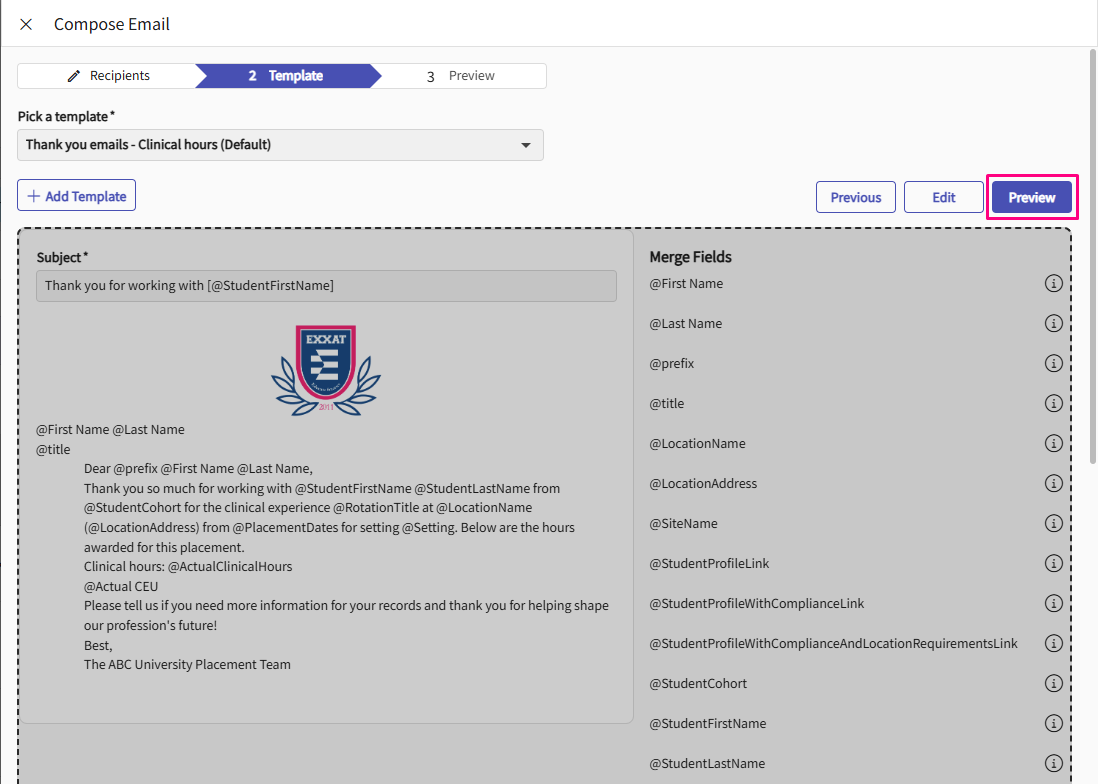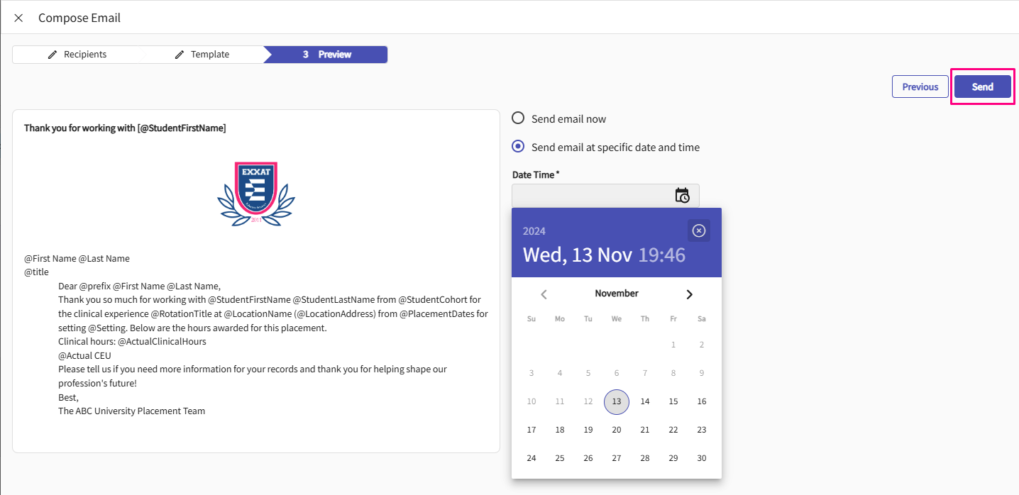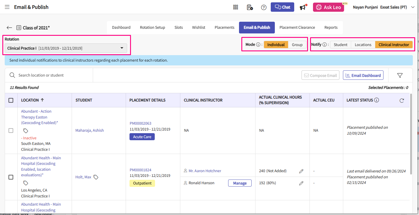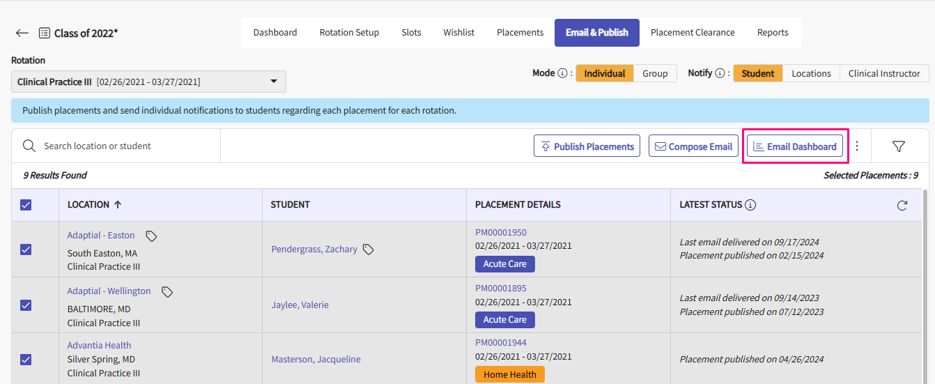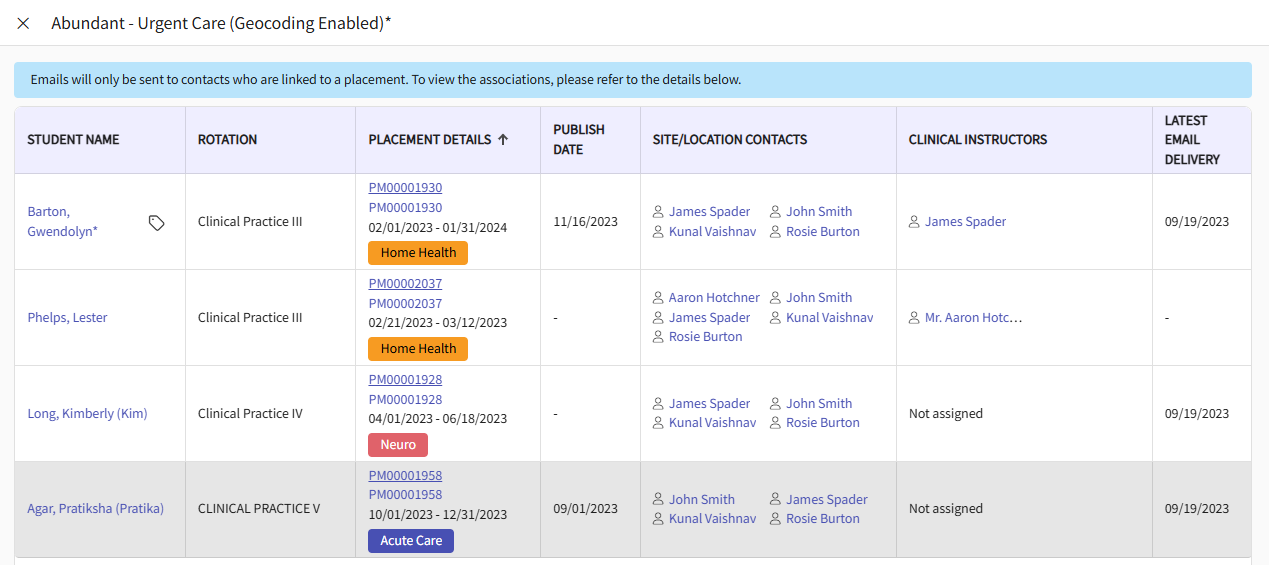 Once you’ve placed and published student placements, you can send out placement notifications and 'Thank You' emails to the Preceptor / Clinical Instructor / Educator.