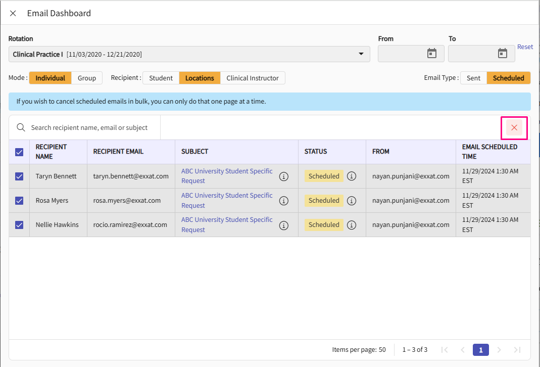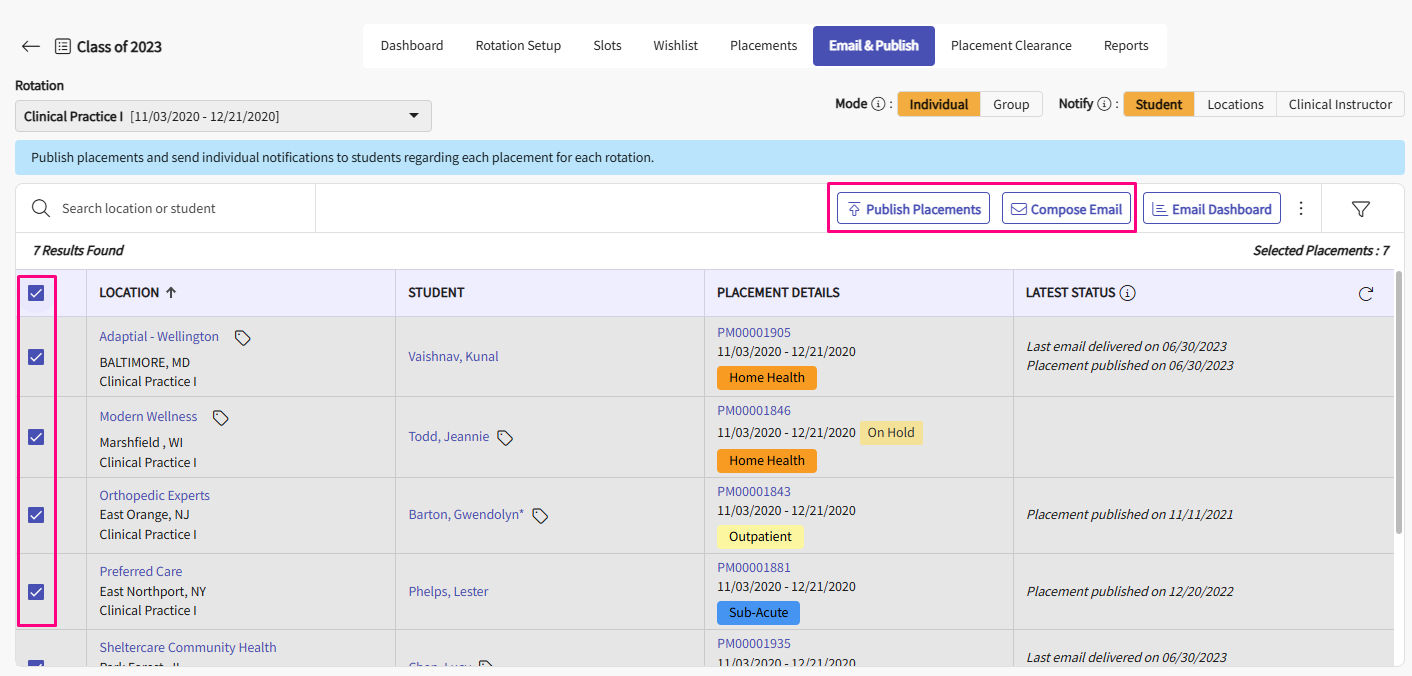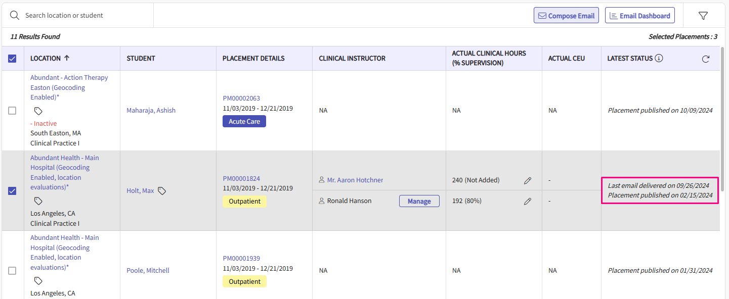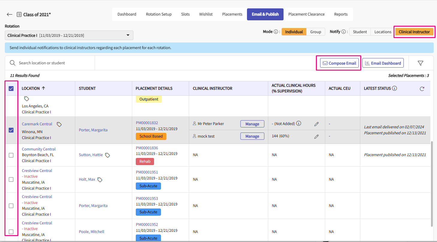 - To send emails to Clinical Instructors select the placements from the list and click Compose Email. Note: You will only be able to select placements that have a Clinical Instructor updated.