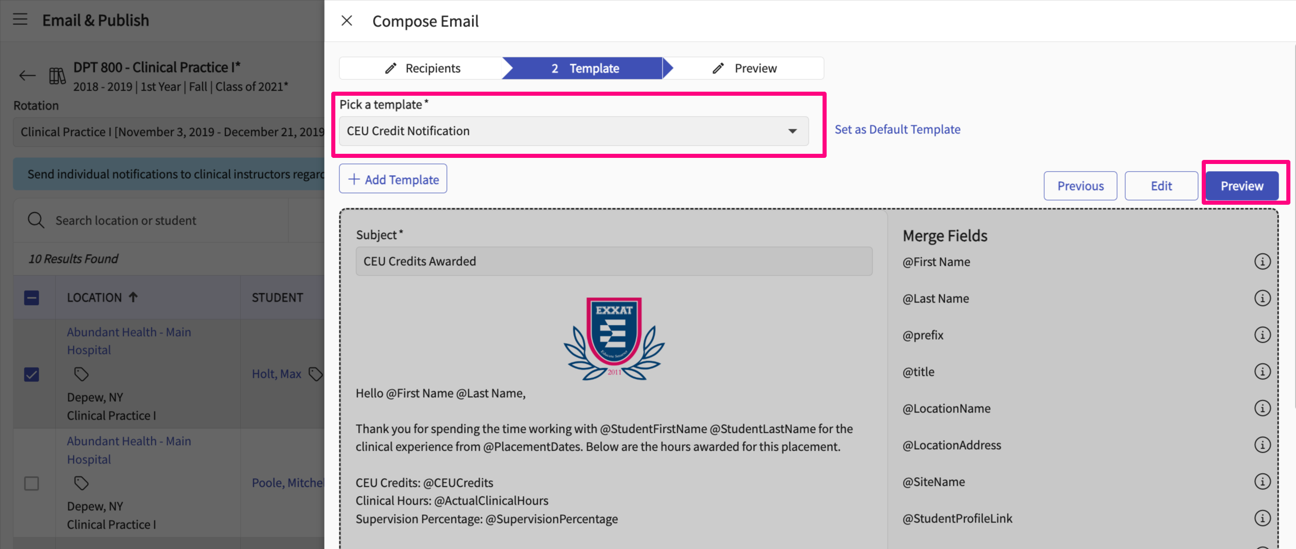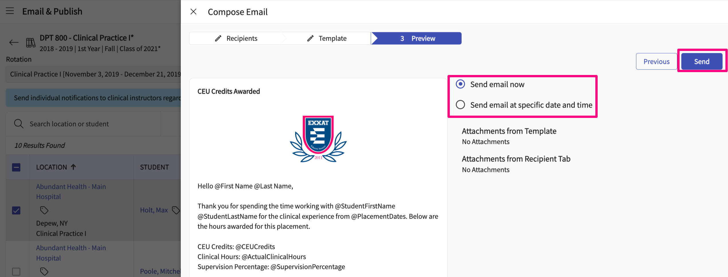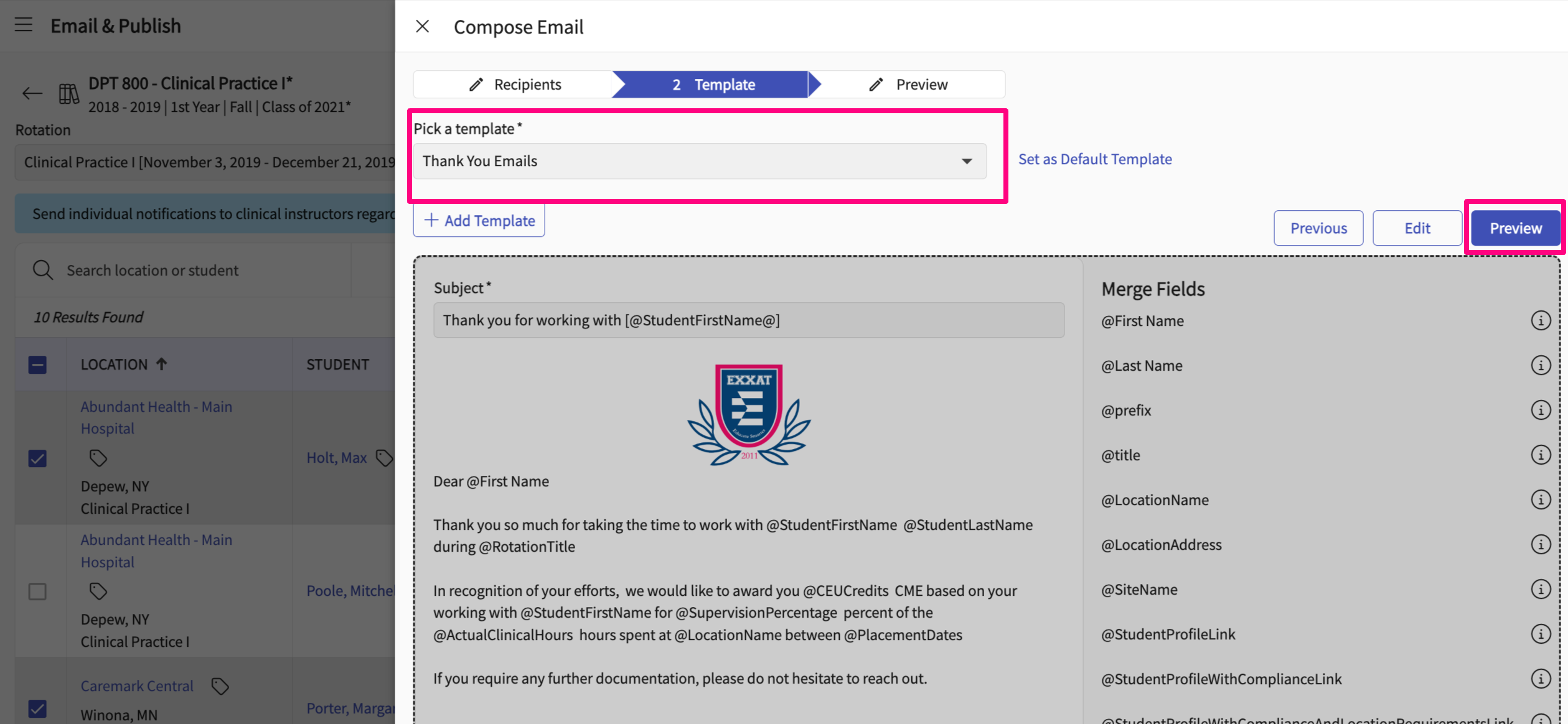 Note: To set up Thank You Emails and Certificates for PT programs, contact the Exxat support team. Once they've created the email template, you can choose it from the template options.