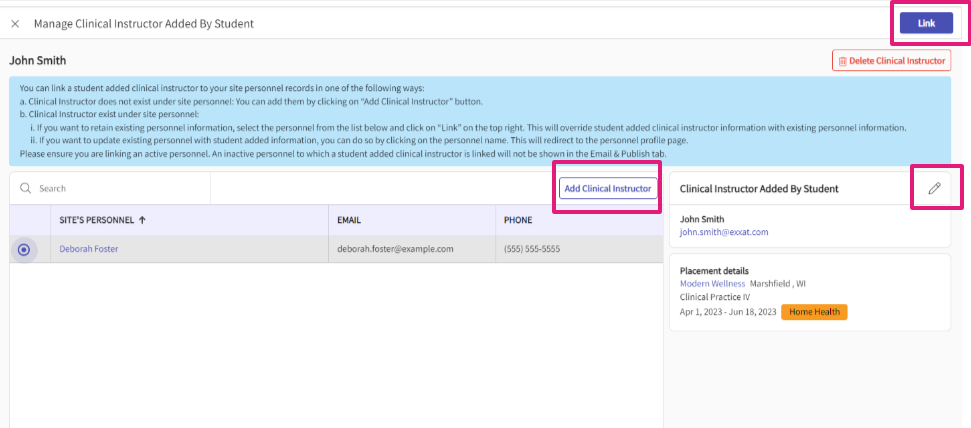 - If you want to retain existing personnel information, select the personnel from the list below and click on “Link” on the top right. This will override student-added clinical instructor information with existing personnel information.