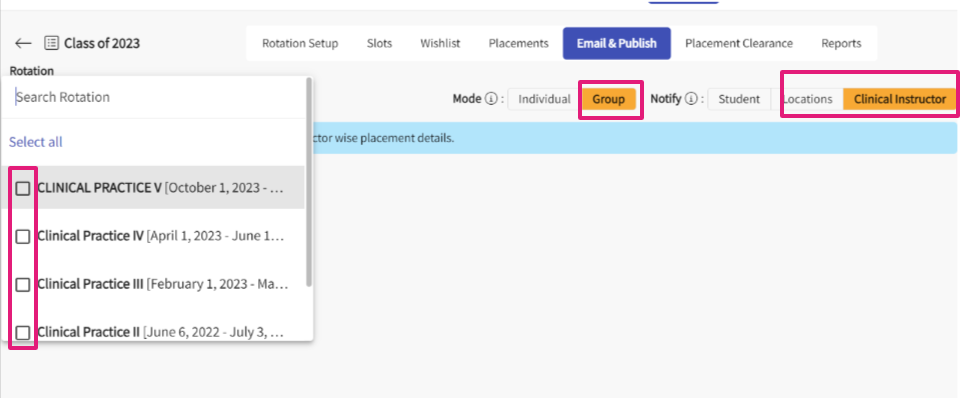- At the administrator end, click on Placement Module >> Email & Publish Tab >> Notify: Clinical Instructor option