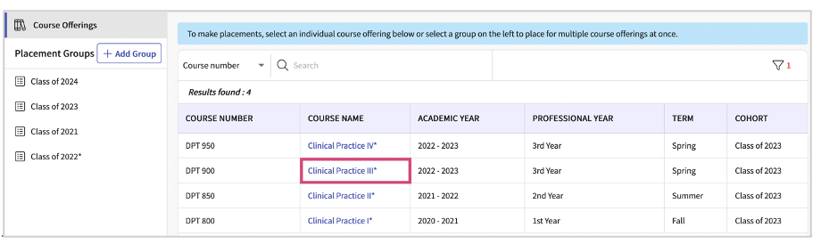- If the clinician column has NA for any placements, you must associate a clinician with the placement or request your student add them to their placement (if applicable) before you can send them notifications.
