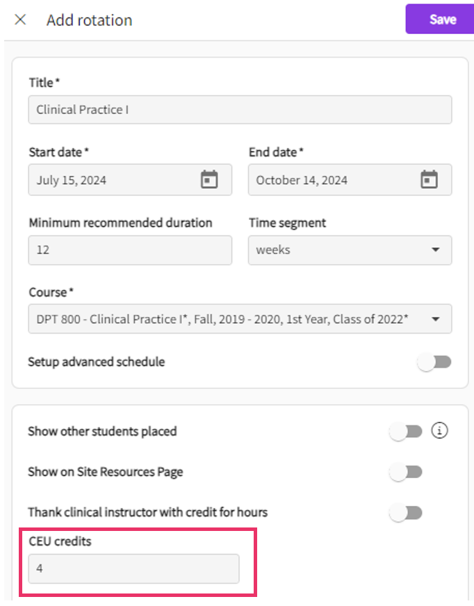 - Ensure that key attributes, such as Clinical Hours, Timesheet Hours, or CEU Credits, are properly configured when setting up a rotation.